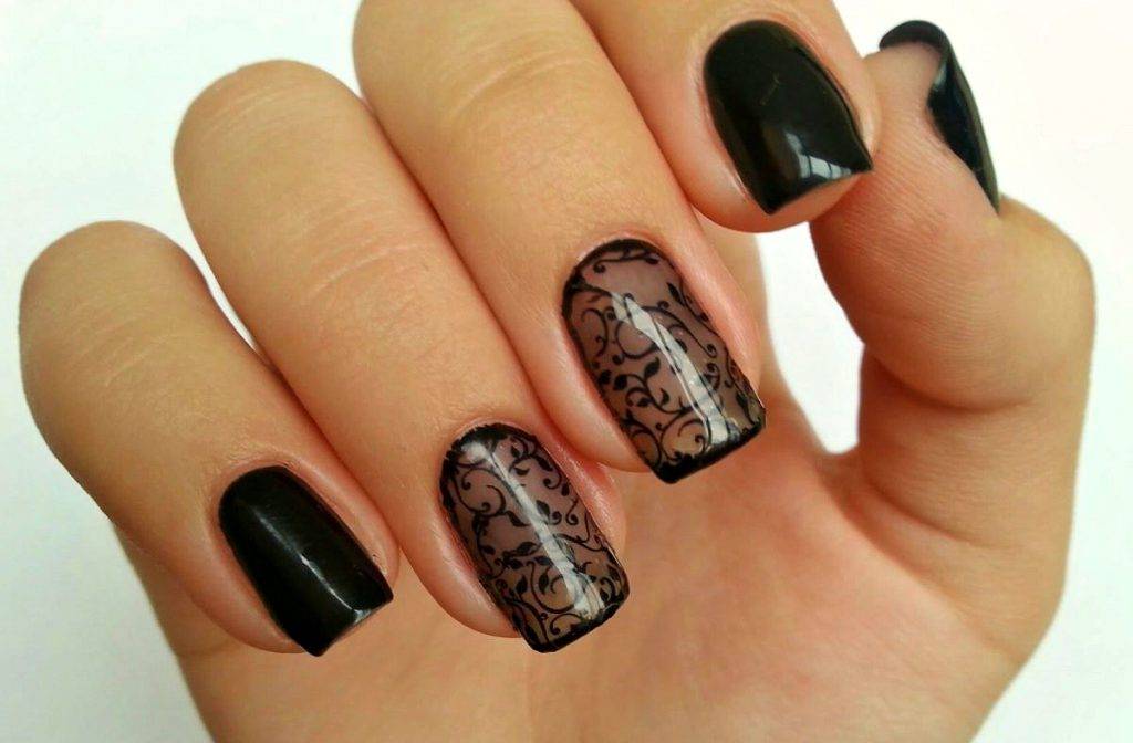 Гель-лак также может использоваться для получения дизайна кружева. Если смешать черный гель-лак с закрепителем, можно получить эффект дымчатости. Наносится узор стемпингом или наклейками, можно выполнить вручную.