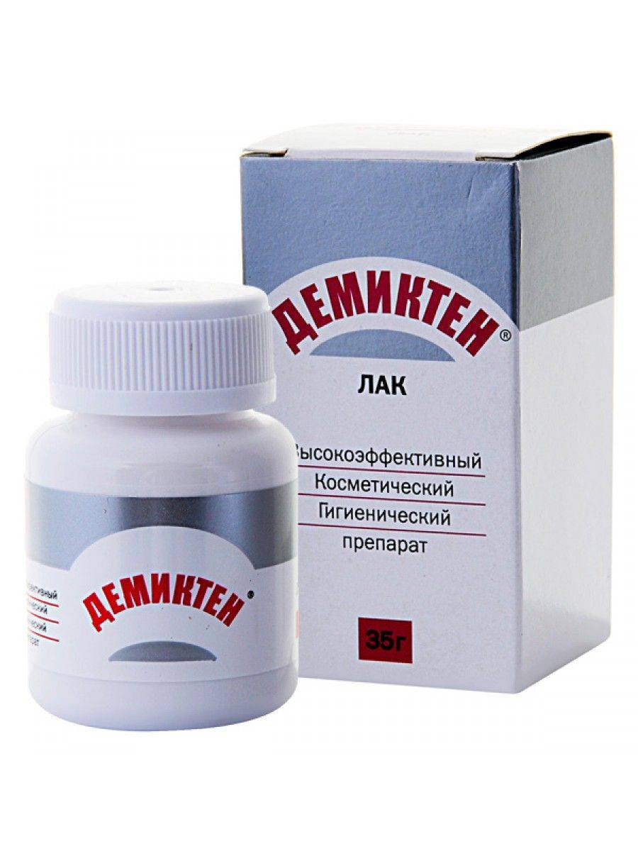 Одним из наиболее распространенных лечебных средств является лак «Демиктен», который характеризуется облегченной структурной формулой и относительно доступной ценой, а также может продаваться без рецепта дерматолога.