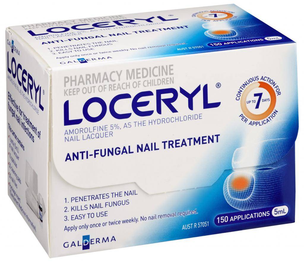 Лак Лоцерил — наиболее известное лекарство от грибка ногтей в такой лекарственной форме. Действующее вещество в составе – аморолфин. Лечебное средство наносят на пораженные и здоровые ногти 1 – 2 раза в неделю, длительность курса 6 — 12 месяцев.