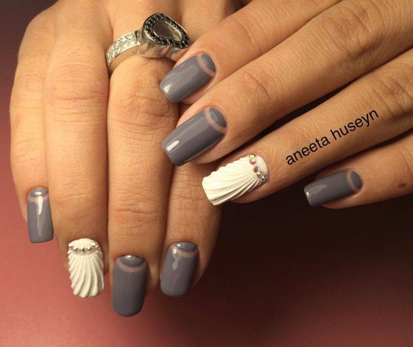 Матовый серый маникюр выглядит очень стильно и оригинально даже в чистом виде, если подобрать красивый оттенок. Часто матовый дизайн смешивают с глянцем, создавая тем самым комбинированный маникюр. А чтобы облагородить и разнообразить дизайн на серые матовые ногти наносят объемный рисунок, присыпают мерцающей пудрой или украшают бисером, блестками и стразами.