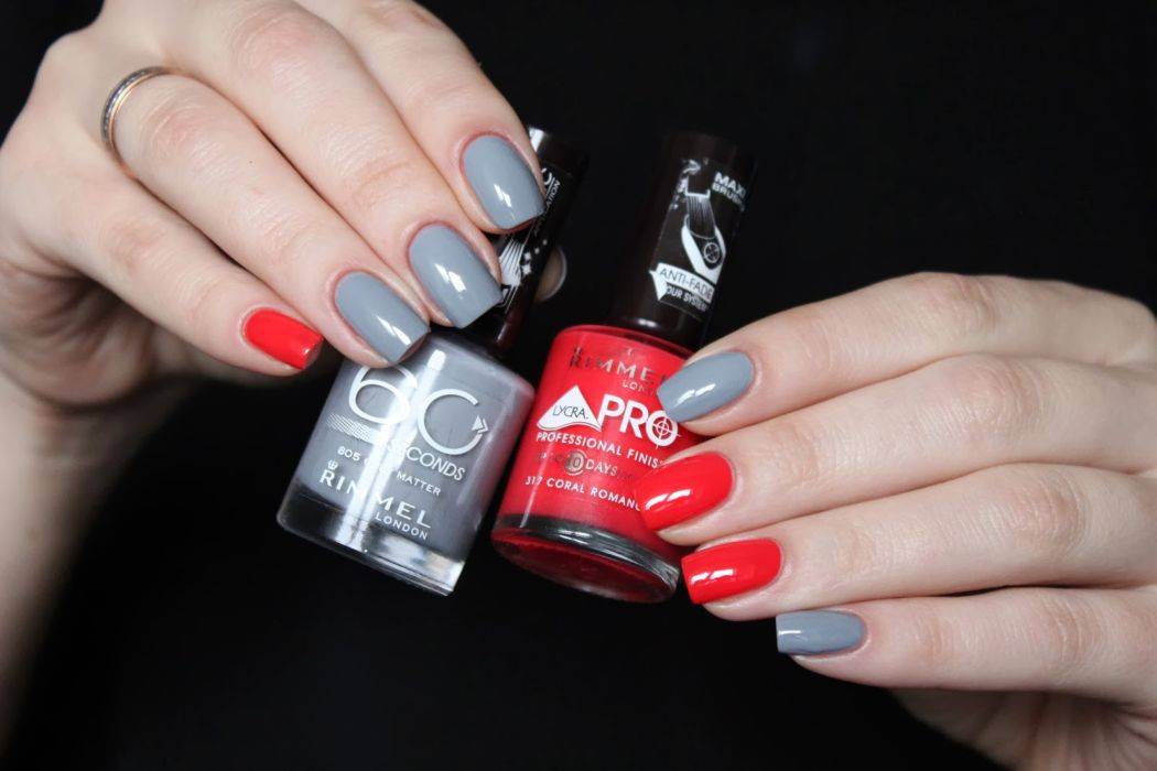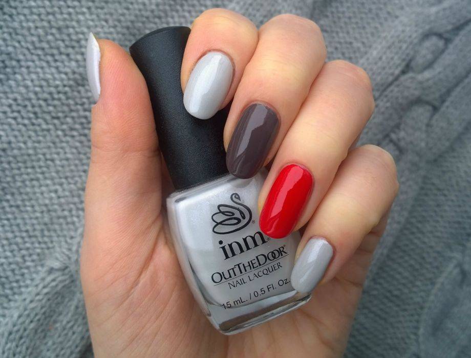 Дополнить дизайн можно стразами или бульонками. Если хочется сделать более спокойный красно-серый маникюр, то лучше использовать стиль минимализм или классический дизайн фэн-шуй.