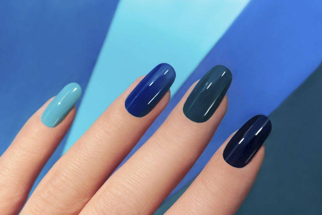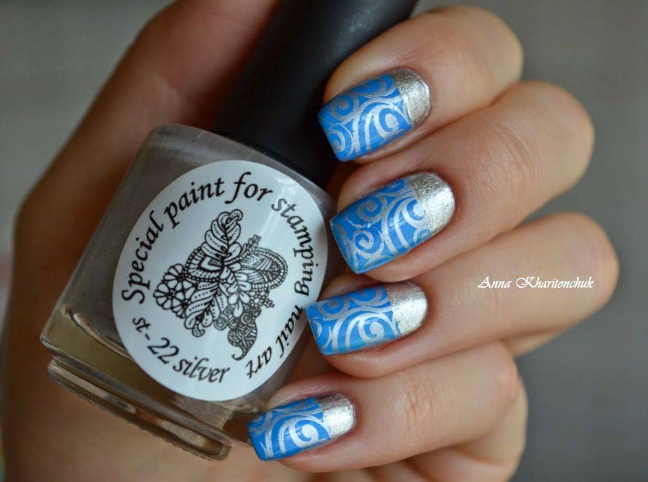 Серо-синяя цветовая гамма актуальна для сезона осень – зима. Дополнить дизайн можно серебристым блеском пудры, страз или фольги. Красиво на ногтях смотрятся новогодние серо-синие снежинки или вензеля.