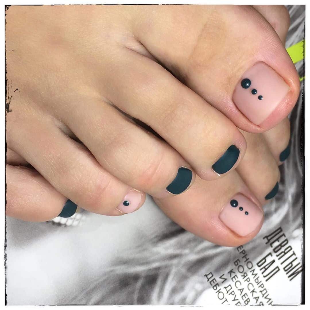 Восхитительно смотрится педикюр с матовым лаком, когда на черном фоне появляется небольшой изящный белый принт.