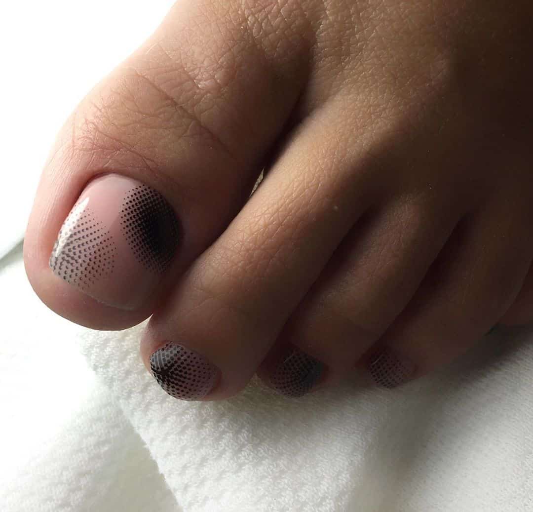 Геометрические узоры — украшают любой педикюр, но наиболее оригинально они выглядят на покрытиях, близких к натуральному бежевому цвету. Среди модных тенденций стали появляться более плавные линии и фигуры без четких границ и углов. Сам рисунок может наноситься не только лаковыми покрытиями, но и стразами, блестками, а также с помощью штампов и термопленок.