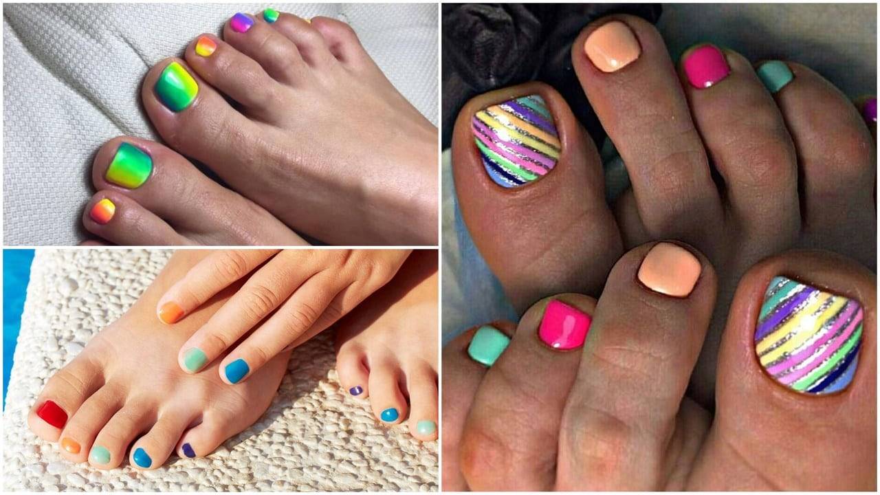 Для летнего педикюра все чаще выбирают радужное оформление. Соединение нескольких ярких цветов смотрится игриво и весело. Разнообразные оттенки могут быть помещены все вместе на одну ногтевую пластину, либо для каждого ногтя выбирается свой тон.