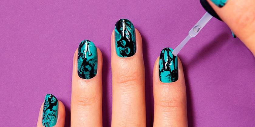 Верхний слой лака, не успевший застыть, частично сотрётся, и появятся разводы, напоминающие рисунок на мраморе. Дайте им высохнуть и завершите маникюр топовым покрытием.