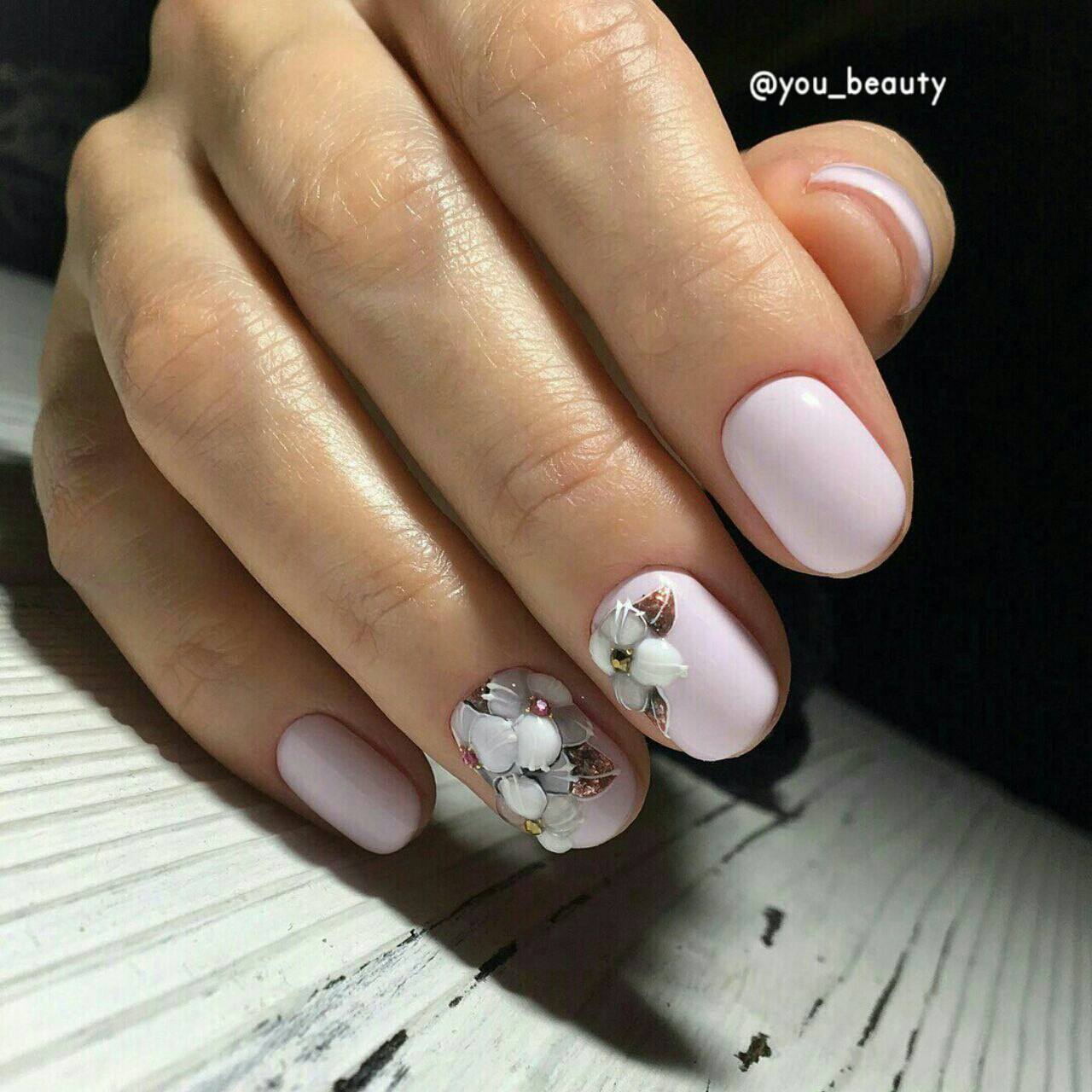 Красиво, но не вызывающе выглядит однотонный маникюр в пастельных тонах. Нюдовые, телесные, бежевые оттенки прекрасно дополнят образ юной девушки. Можно выделить один или несколько ноготков с помощью рисунка.