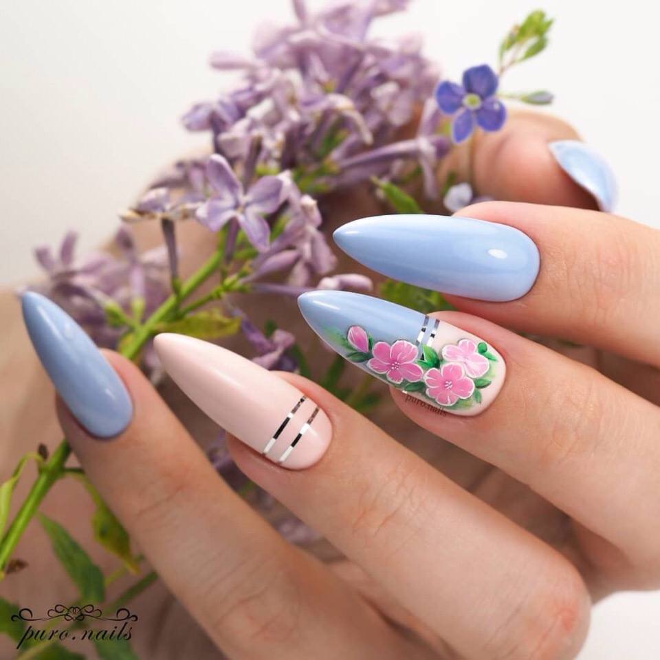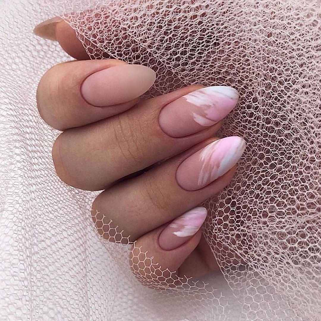 Если вы когда-нибудь выполняли маникюр с сакурой, то у вас не возникнет проблем с миндальным дизайном. Используйте для декора розовые оттенки, белый, светло-фиолетовый цвета. Это позволят создать детальный и глубокий узор с нежными цветами миндаля.