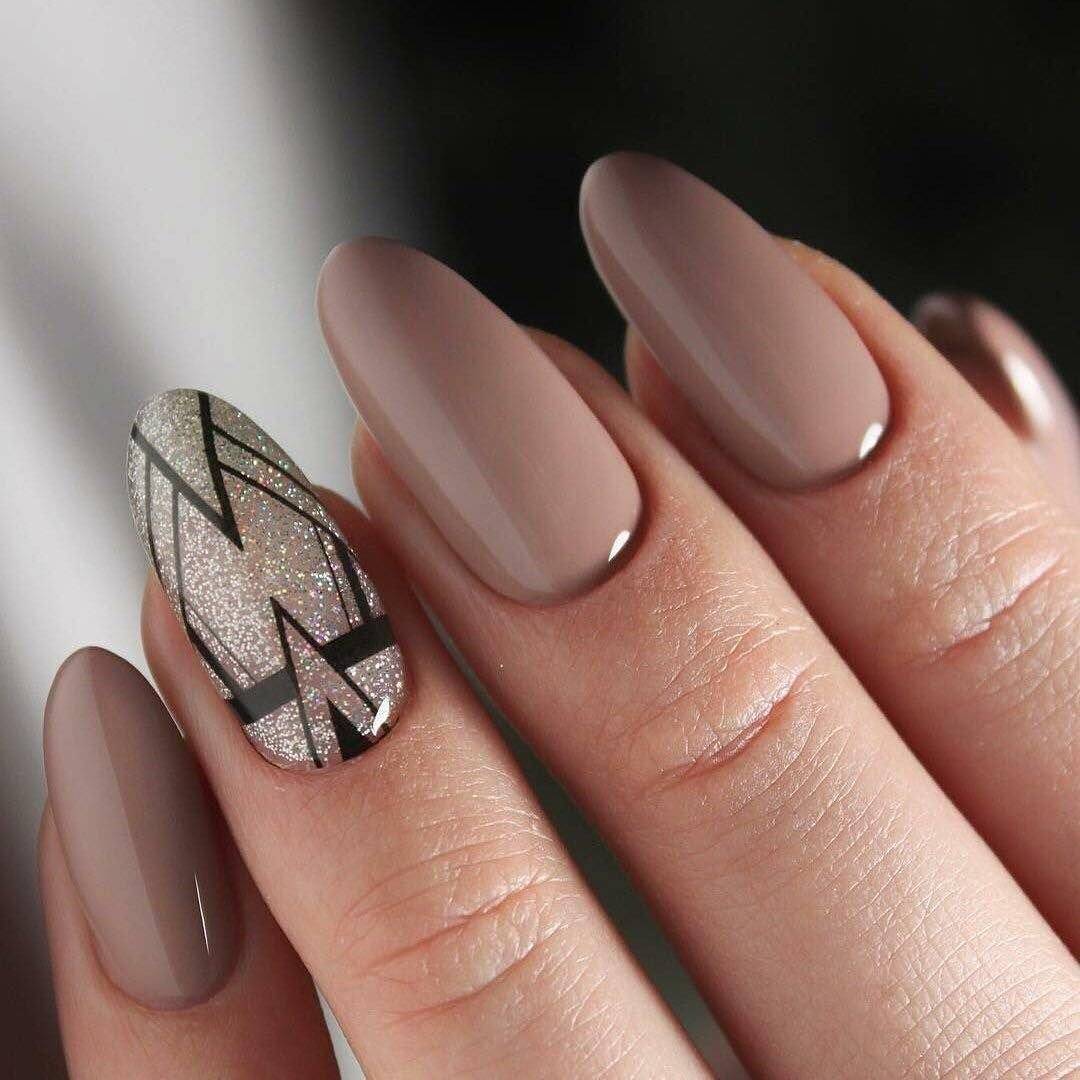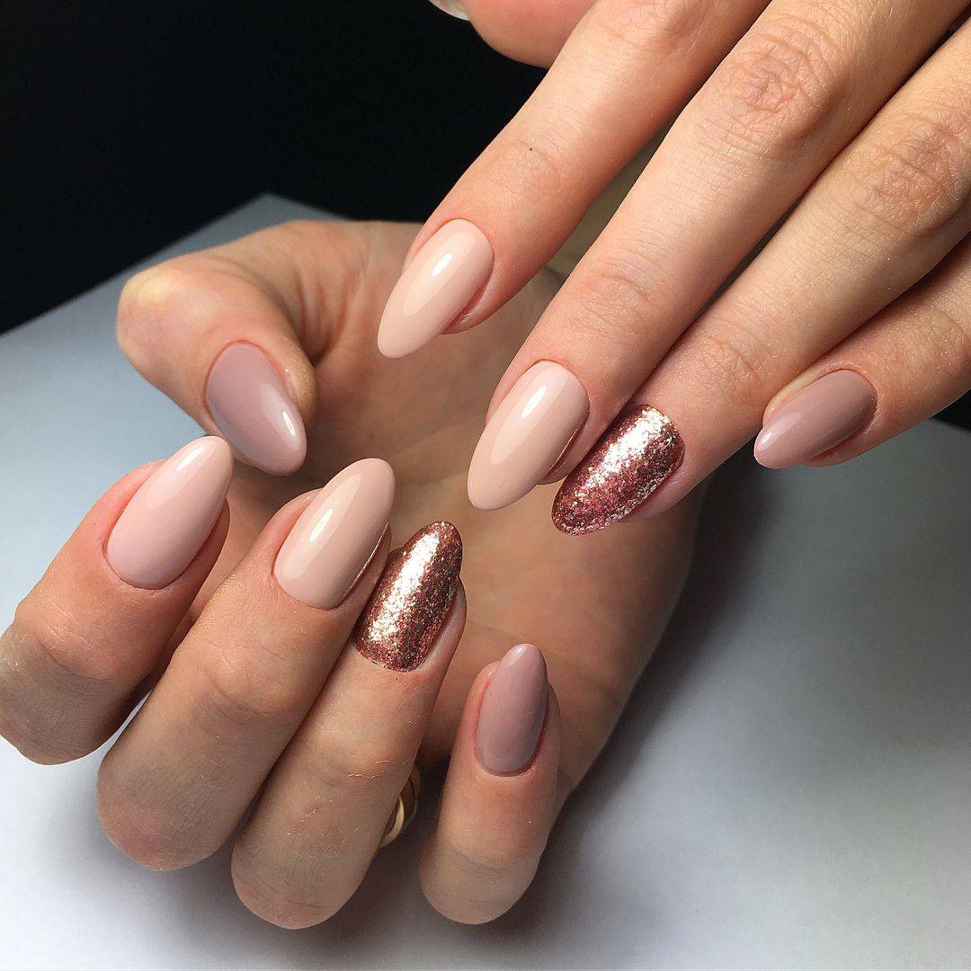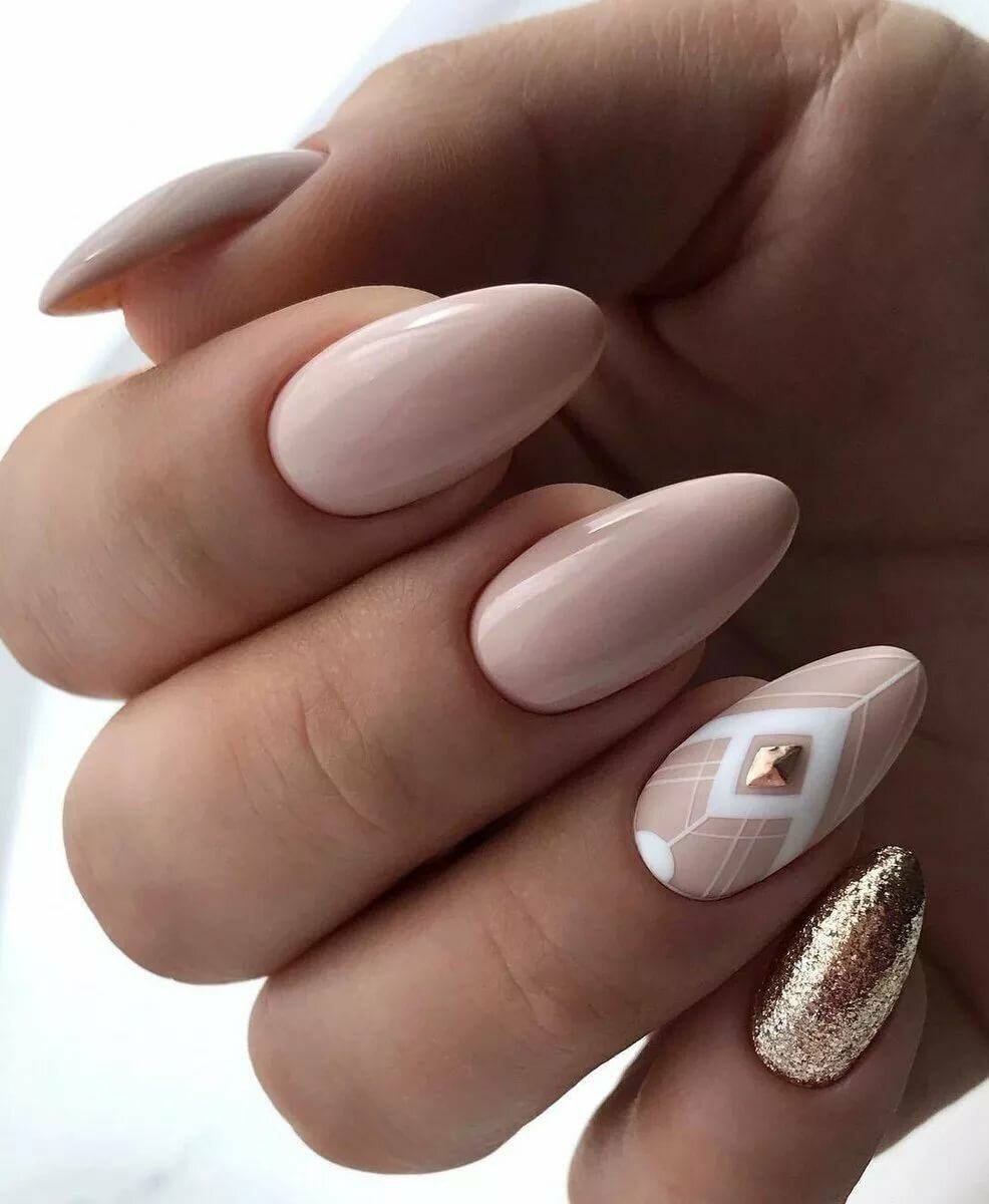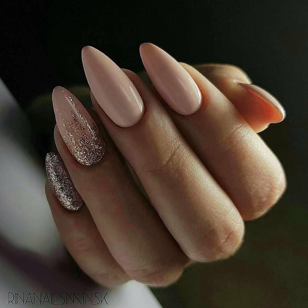 Идеальным дополнением миндального маникюра с геометрией станет серебряный или золотой глиттер. Причем золотой декор может присутствовать в повседневных образах. Дело в том, что миндальный и золотой цвет визуально схожи по колористике и идеально гармонируют в одном нейл-арте. Используйте глиттер для однотонного покрытия 1-2 ноготков на руке, например, безымянного и мизинца.
