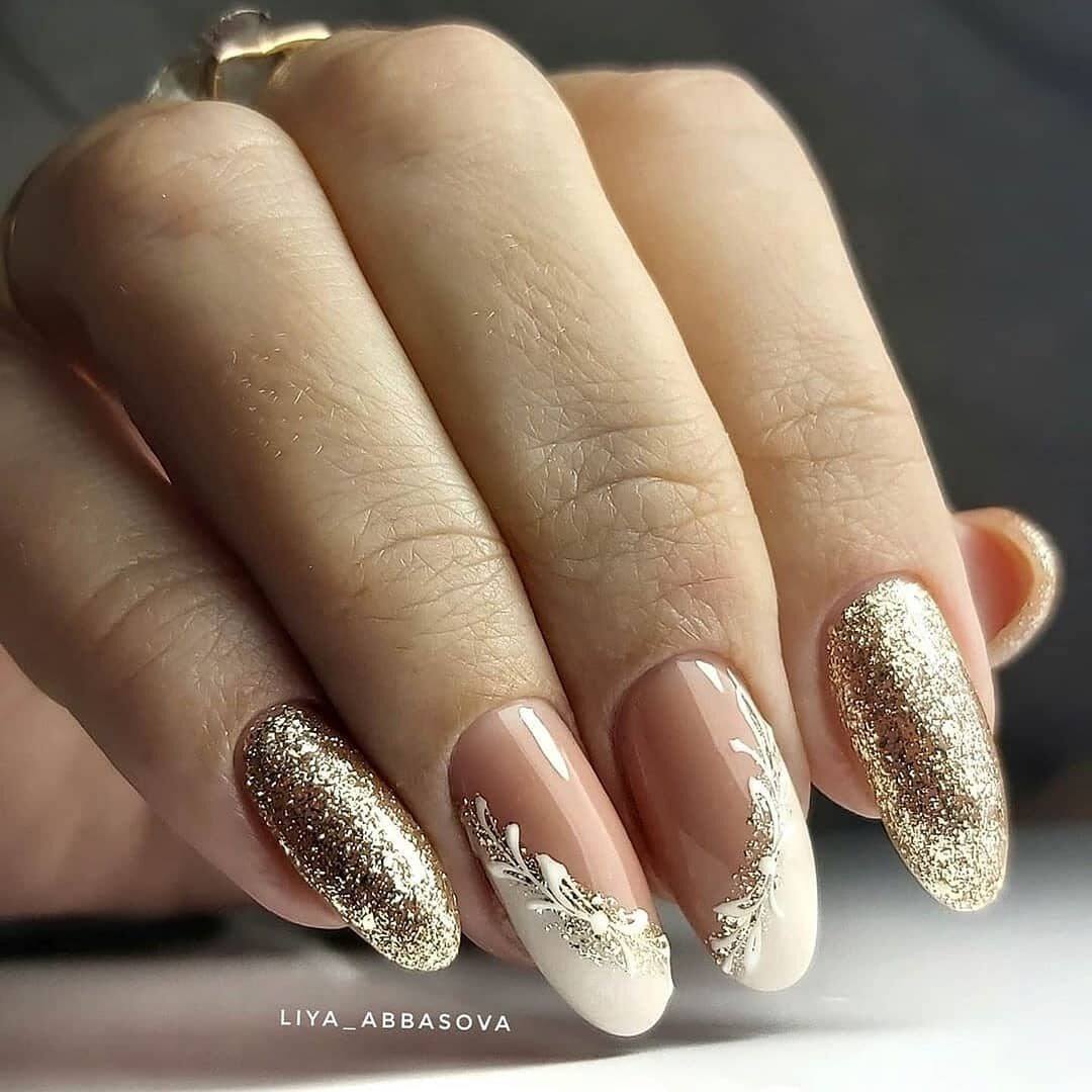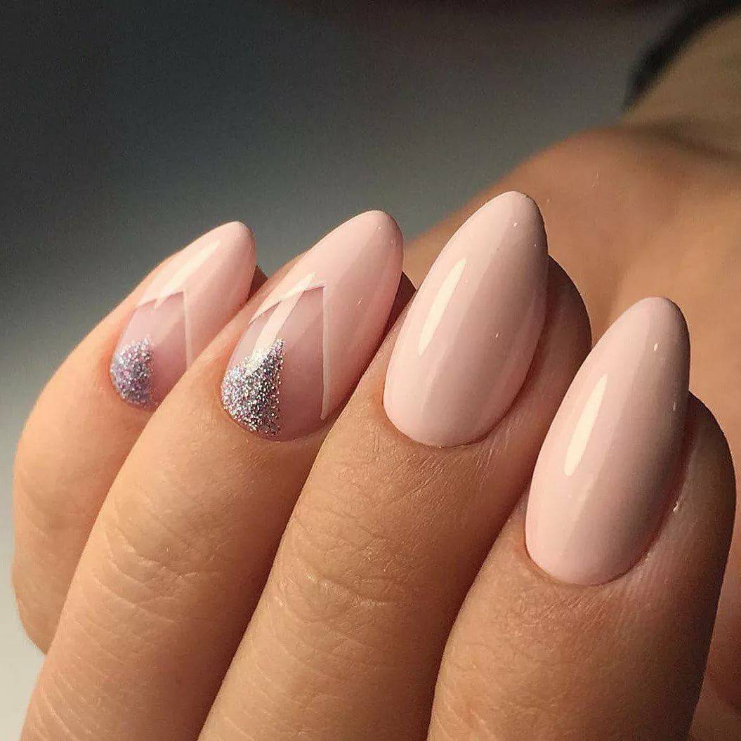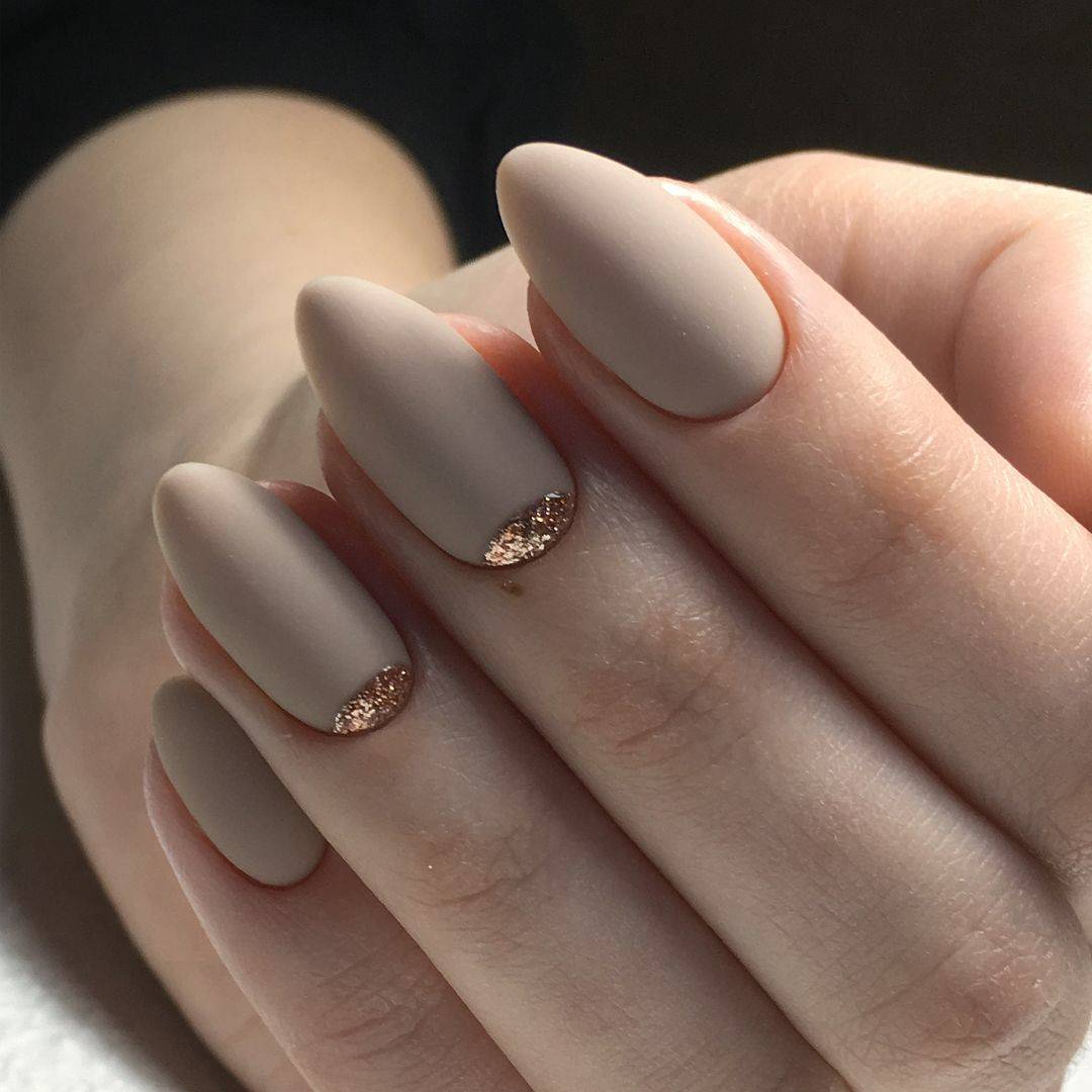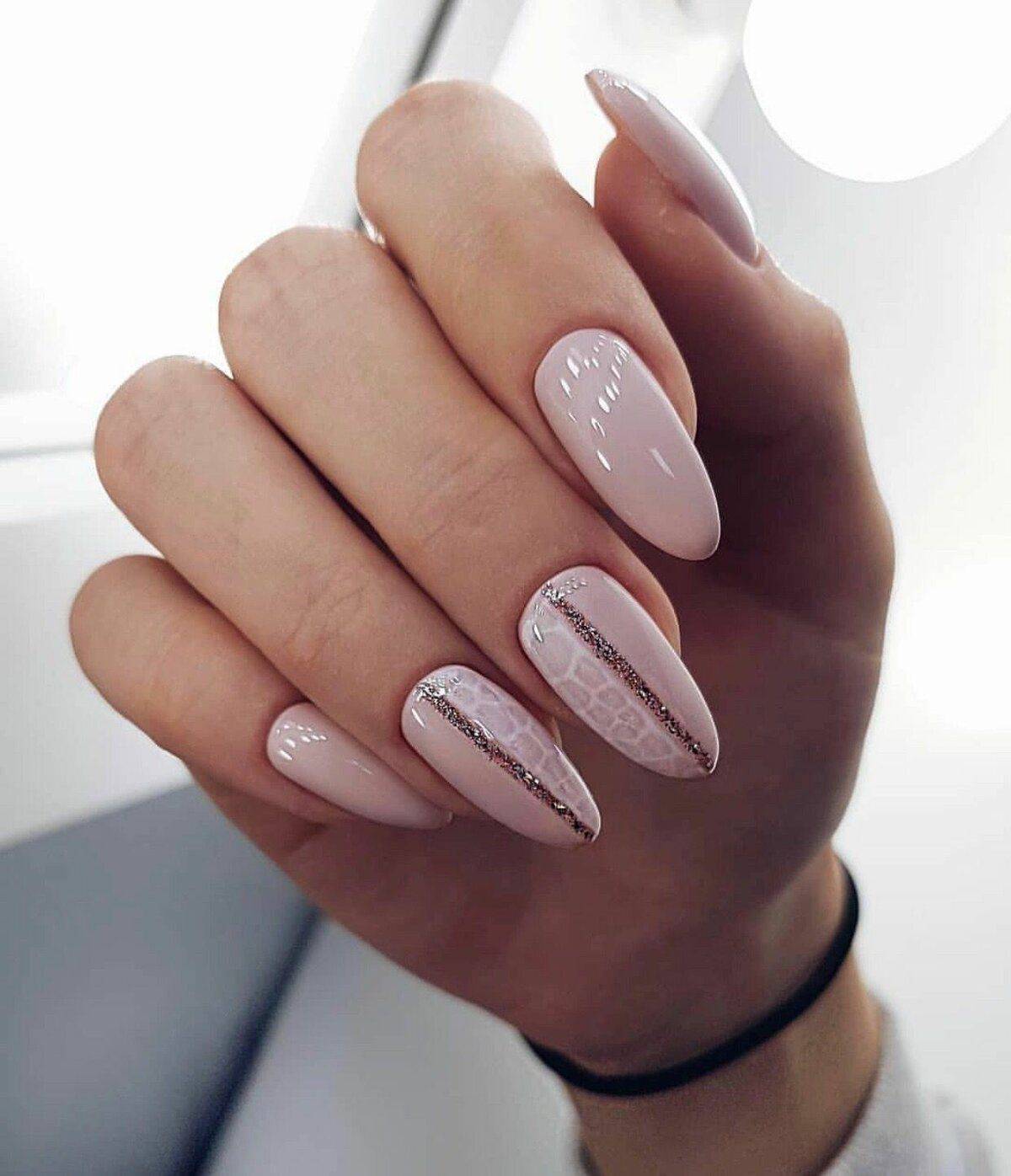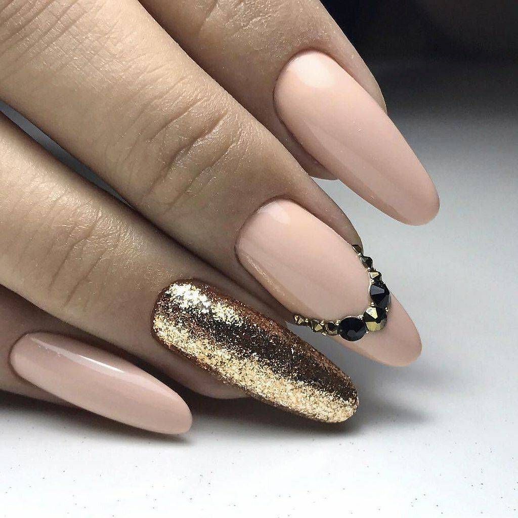 Идеальным дополнением миндального маникюра с геометрией станет серебряный или золотой глиттер. Причем золотой декор может присутствовать в повседневных образах. Дело в том, что миндальный и золотой цвет визуально схожи по колористике и идеально гармонируют в одном нейл-арте. Используйте глиттер для однотонного покрытия 1-2 ноготков на руке, например, безымянного и мизинца.