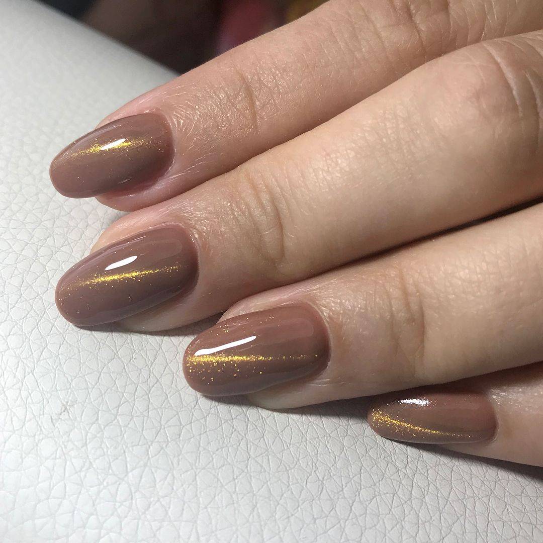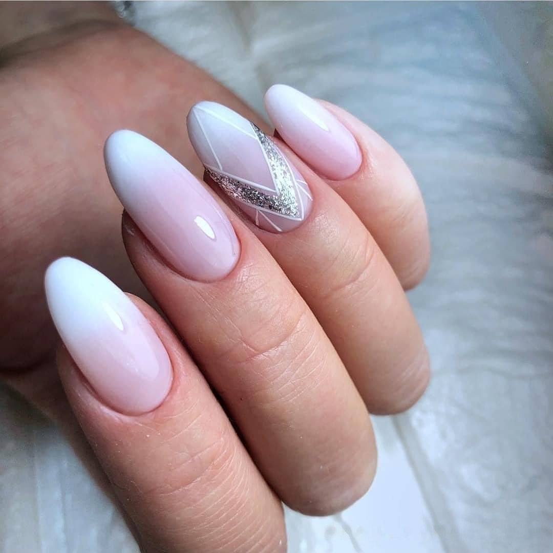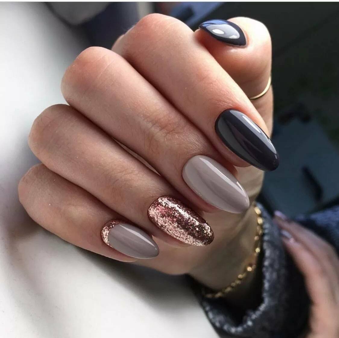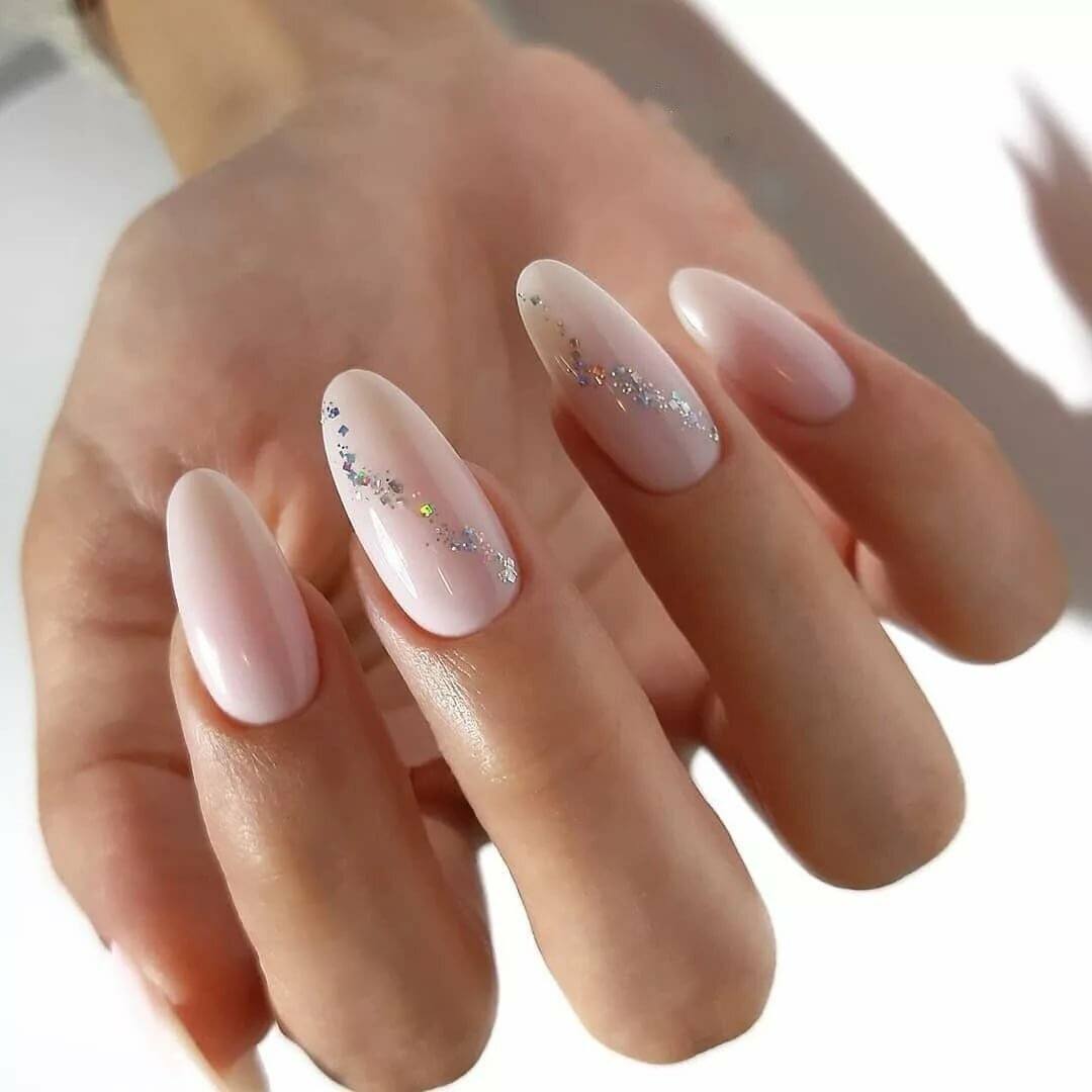 Идеальным дополнением миндального маникюра с геометрией станет серебряный или золотой глиттер. Причем золотой декор может присутствовать в повседневных образах. Дело в том, что миндальный и золотой цвет визуально схожи по колористике и идеально гармонируют в одном нейл-арте. Используйте глиттер для однотонного покрытия 1-2 ноготков на руке, например, безымянного и мизинца.