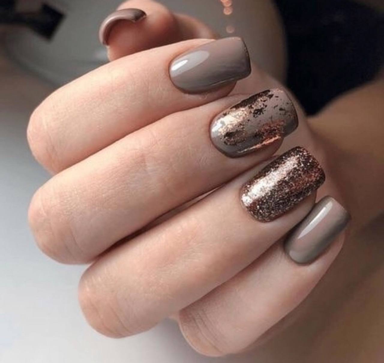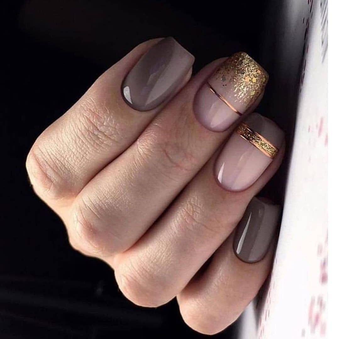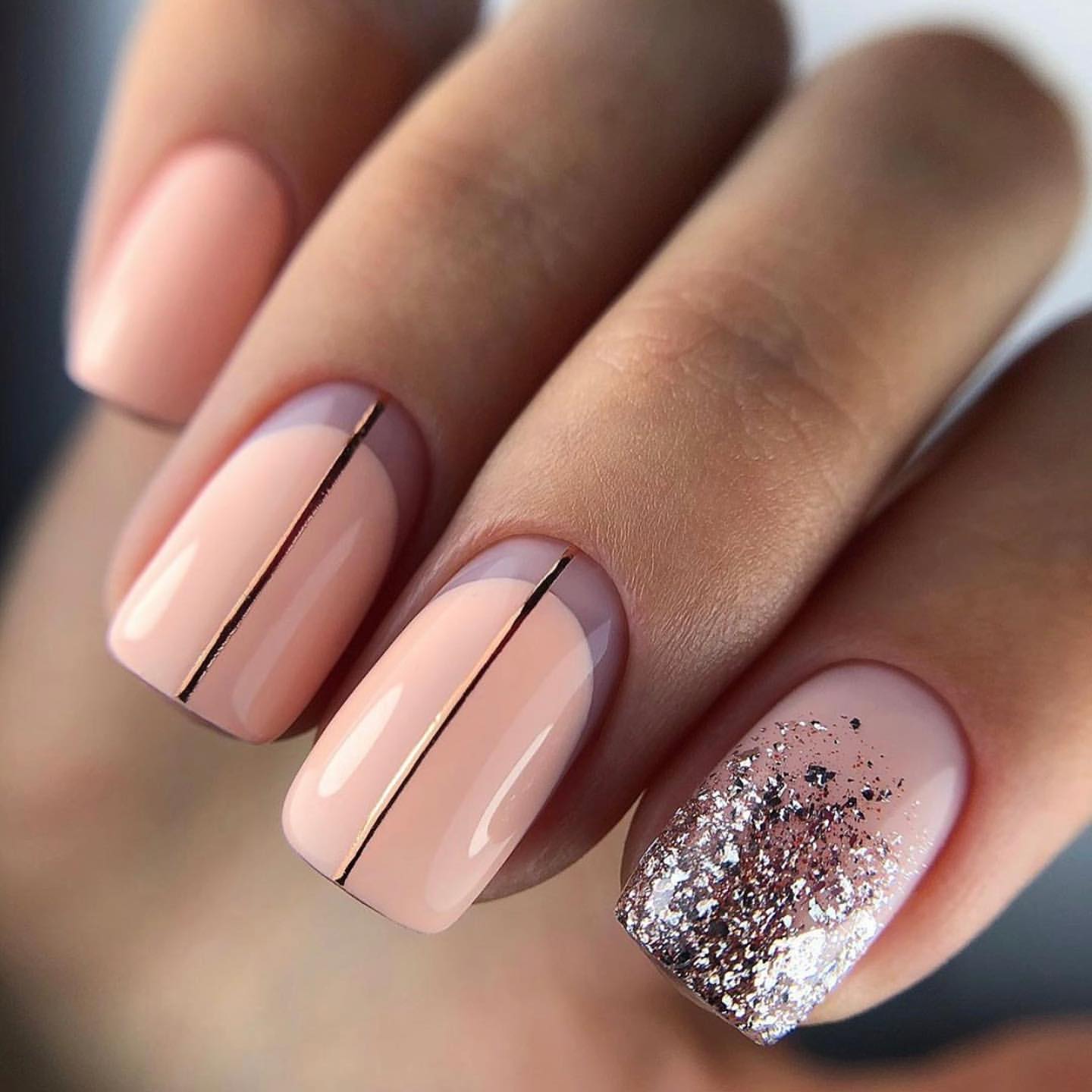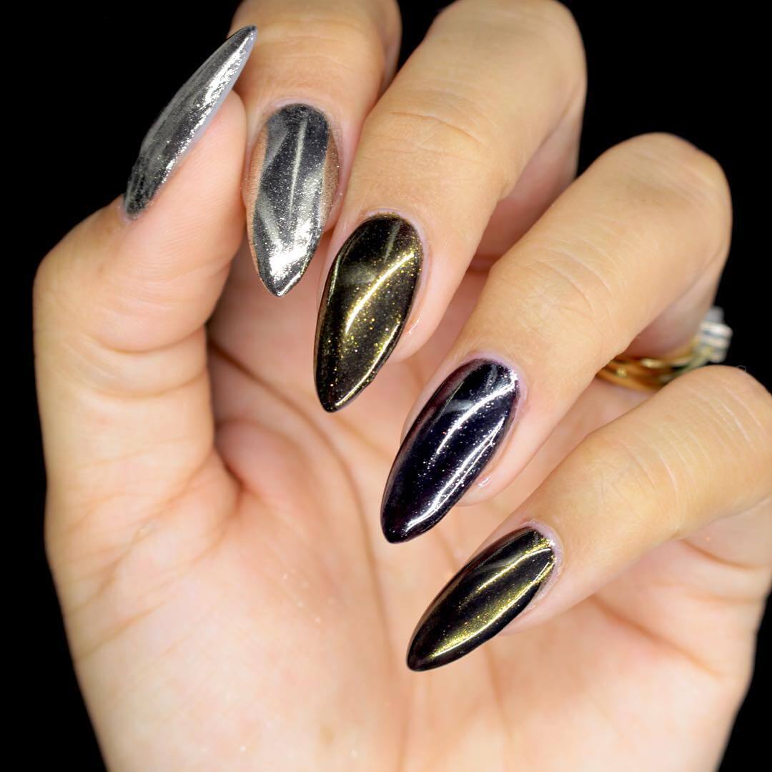 Идеальным дополнением миндального маникюра с геометрией станет серебряный или золотой глиттер. Причем золотой декор может присутствовать в повседневных образах. Дело в том, что миндальный и золотой цвет визуально схожи по колористике и идеально гармонируют в одном нейл-арте. Используйте глиттер для однотонного покрытия 1-2 ноготков на руке, например, безымянного и мизинца.