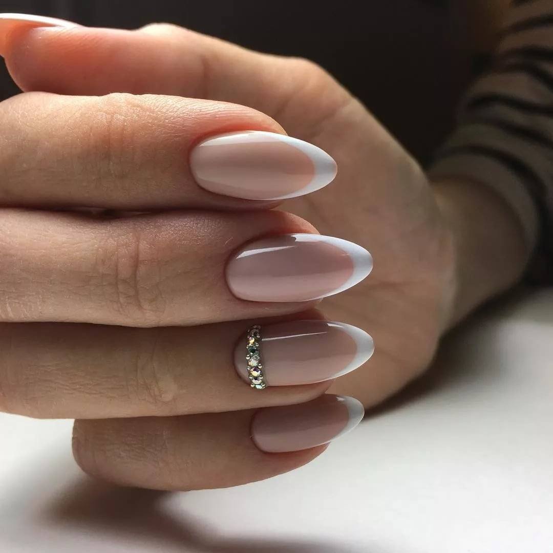 Миндалевидная форма ногтей с покрытием френч – одна из самых популярных среди невест. На фото вы видите простой вариант свадебного маникюра, который подойдет к богато украшенному платью. К платью невесты без декора можно делать маникюр, украшенный стразами блестками и лепкой.