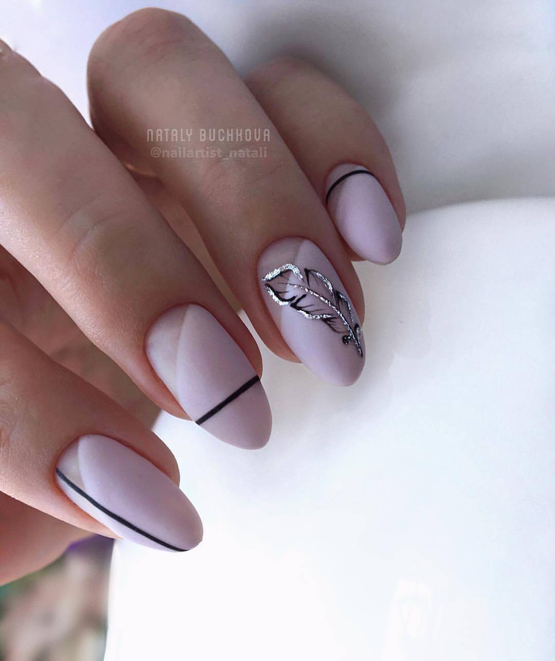 С чем же комбинировать бархатный дизайн ногтей миндальной формы? Конечно же, с минималистичным рисунком! Красивым дополнением будет металлический нейл-арт с растительным мотивом.