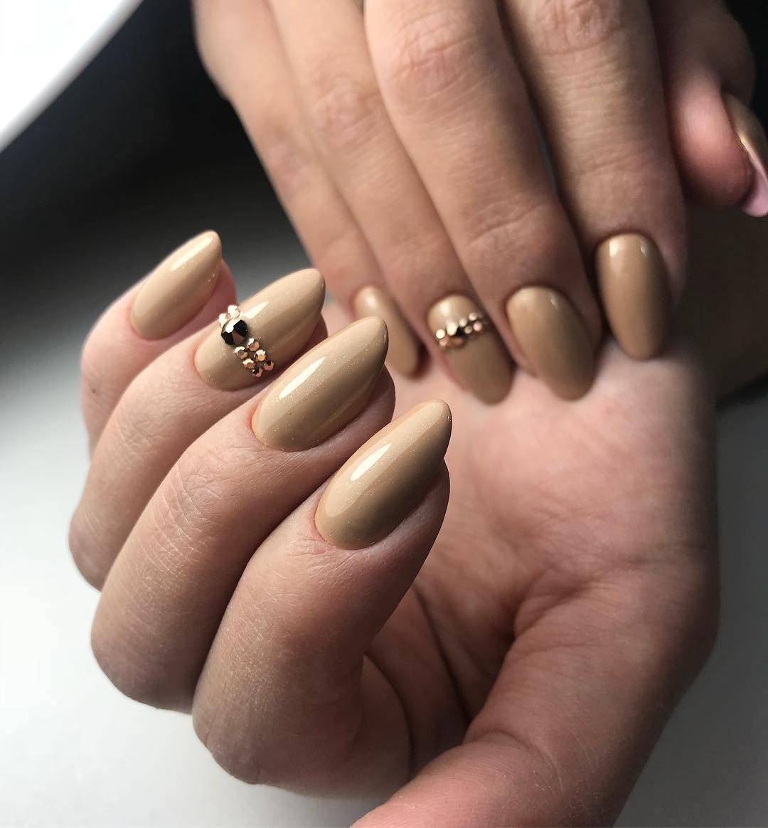 Маникюр миндального цвета – универсальное решение для делового и повседневного образа. Это нейтральный цвет, который отлично смотрится как в образах молодых девушек, так и дам постарше. Миндальный цвет позволяет создать десятки интересных нейл-артов за счет его гармоничного сочетания с черным, белым, розовым, красным и другими тонами.