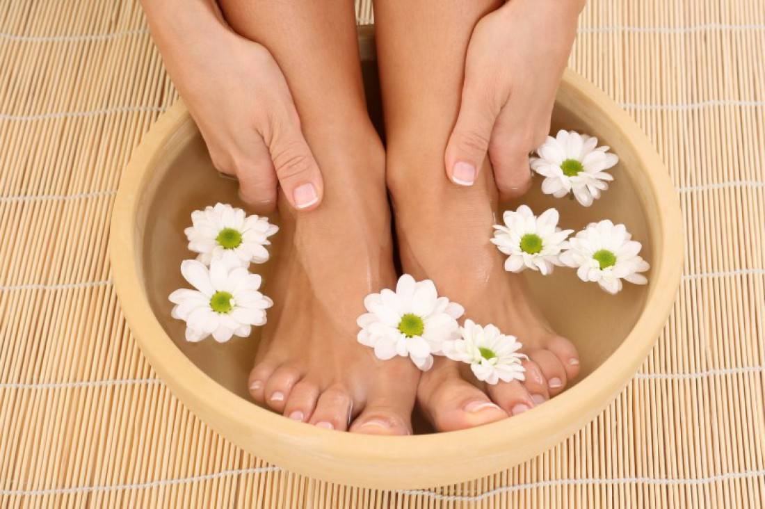 - В классическом педикюре обязательным является распаривание ног. Для этого погрузи их в ванночку с водой 37-40°С на 10-15 минут. В воду предварительно добавь 1 ст.л. соли, 1 ст.л. соды и немного жидкого мыла или геля для душа. Сода дополнительно размягчит и отбелит кожу, а соль – укрепит ногти и снимет отечность. Также можно добавить в воду несколько капель эфирного масла, например, чайного дерева, лимона, розы или лаванды.