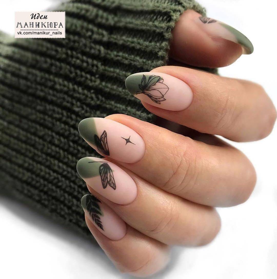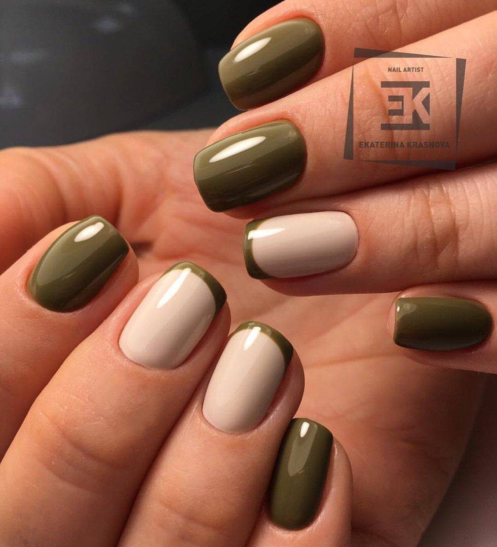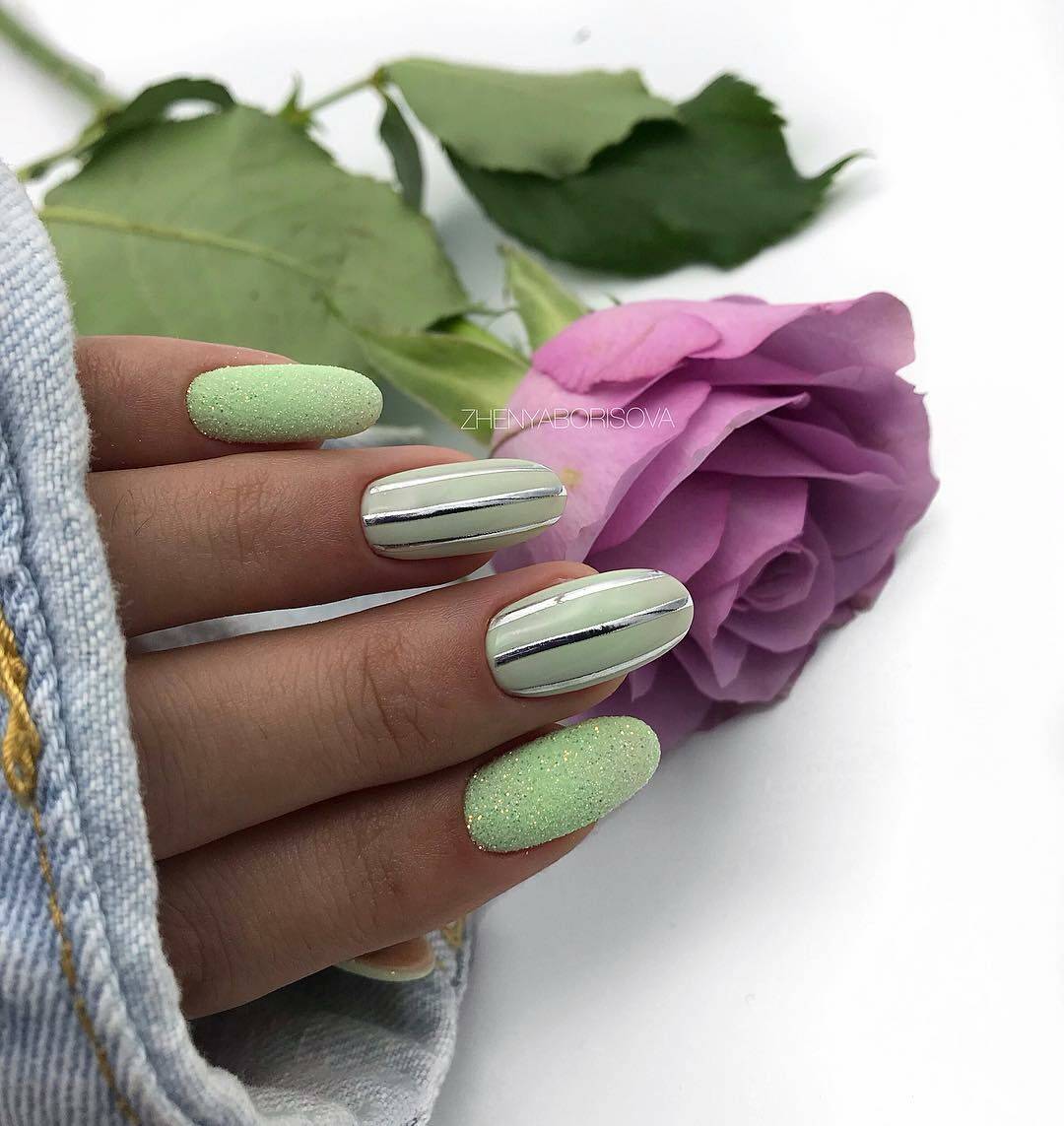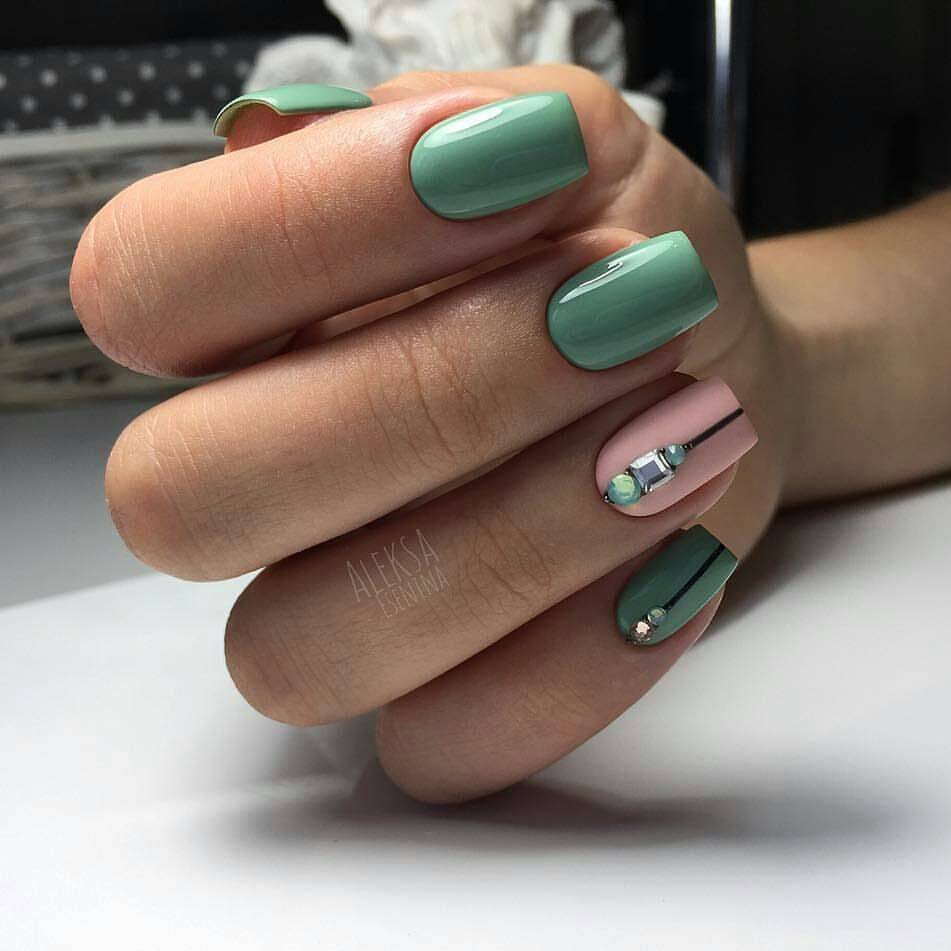 Очень сдержанное и благородное сочетание, которое не оставит равнодушной ни одну модницу. И особенно достойно оно смотрится в матовом исполнении. Дополните таким маникюром свой повседневный летний и осенний лук, и наслаждайтесь теми приятными эмоциями, которые он подарит. Кстати, оттенки зеленого здесь подойдут самые разные — от спокойного оливкового до насыщенного изумрудного.