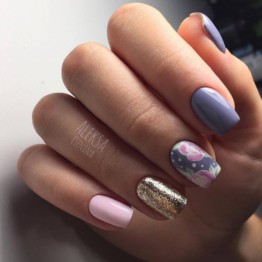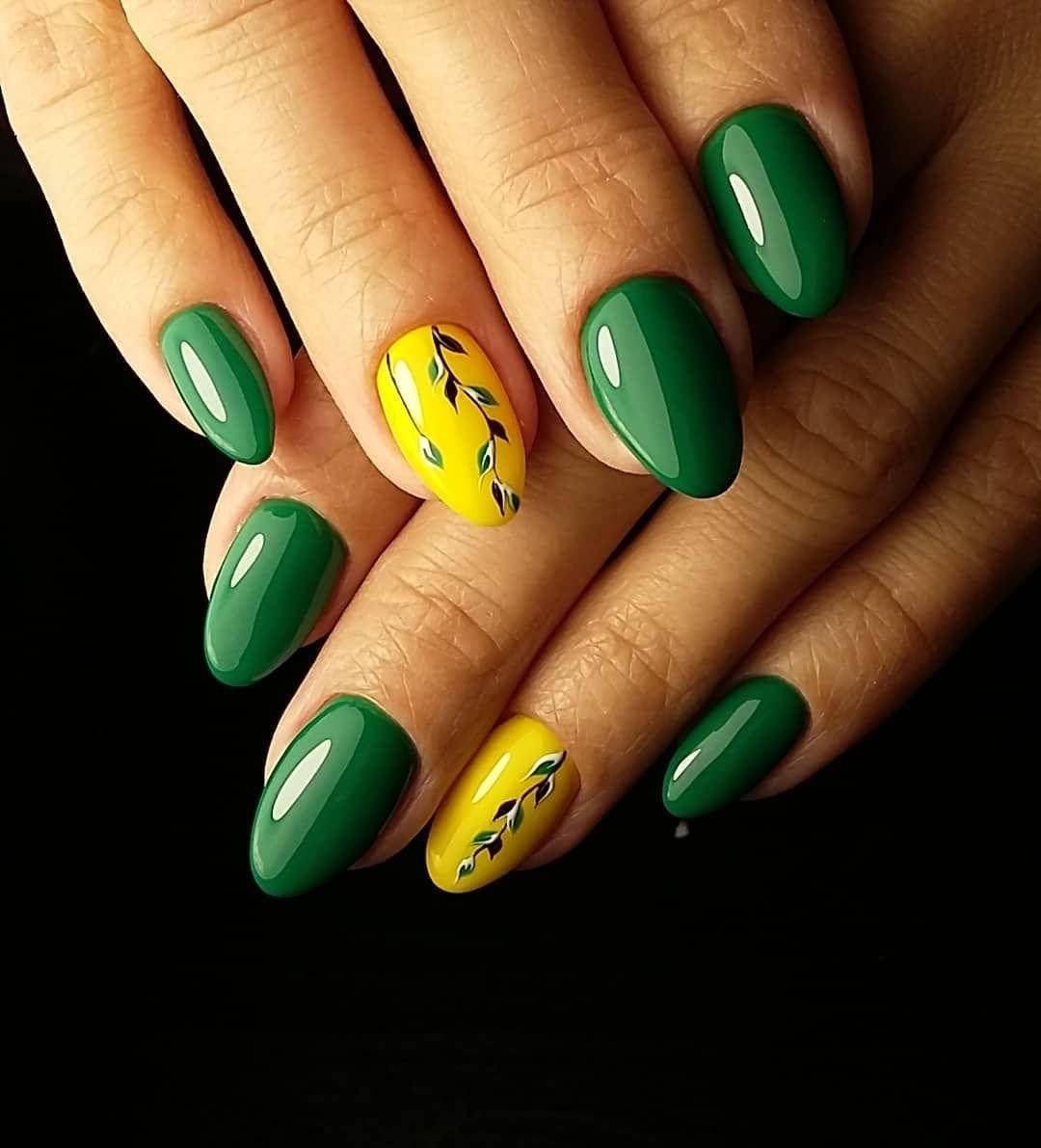 Хотите побаловать себя милыми цветочными узорами в очередном модном дизайне ногтей «разные руки», тогда исполните полдюжины ноготков с матовым темным изумрудом, а другие – с цветочными принтами. Поучится весьма стильный и трендовый маникюр «разные ручки» 2020-2021 для истинных леди.