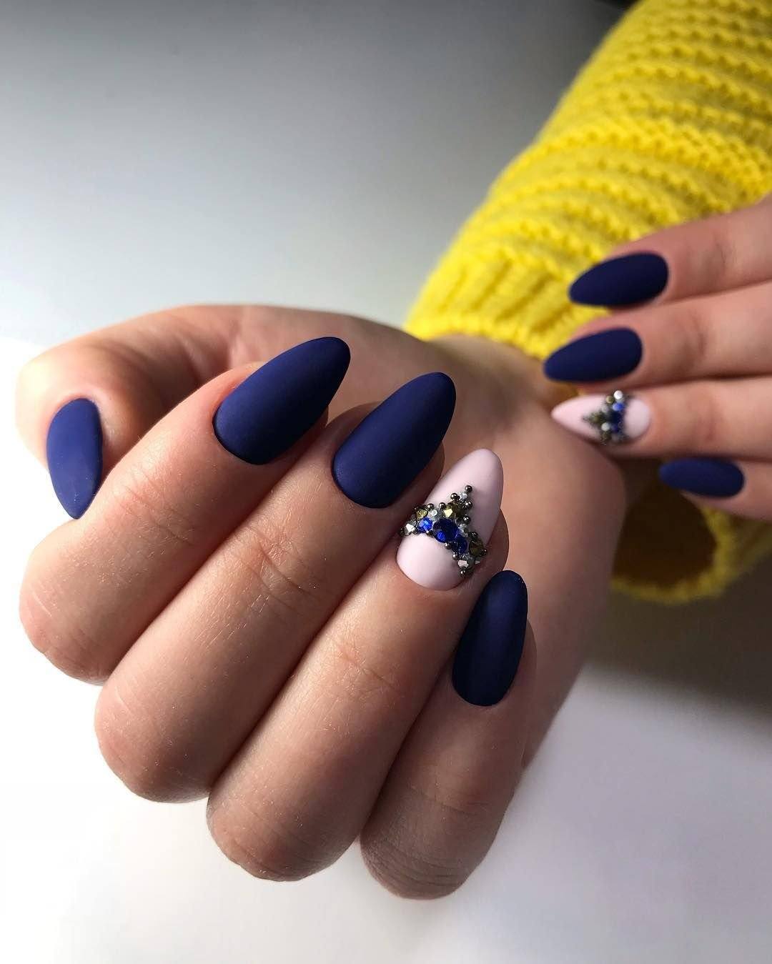 Еще один выразительный микс, который непременно облагородит любой модный образ. Два этих цвета отлично дополняют друг друга и создают динамичный тандем, который особенно хорошо впишется в изысканный вечерний лук. Причем стоит заметить, что одинаково хорошо синий с золотом маникюр смотрится и на длинных, и на коротких ногтях. Рекомендуем использовать сочетание, где синее покрытие будет матовым или глянцевым, а золотое в виде блеска. Не лишними тут окажутся и стразы.