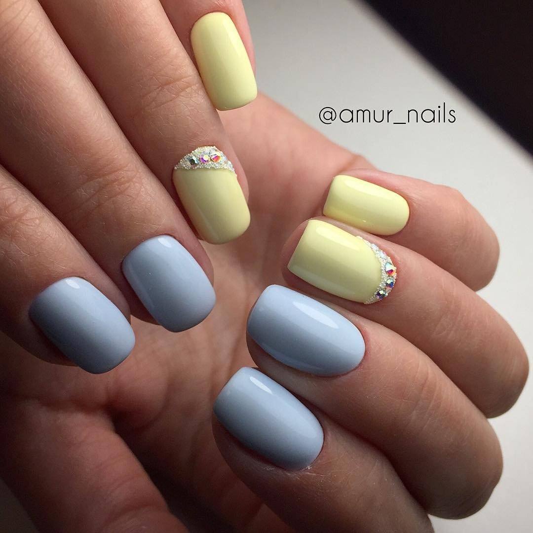 Еще одно мягкое, по-летнему красочное и освежающее сочетание оттенков. На первый взгляд такой подбор колоров может показаться слишком контрастным. Но присмотревшись к нему, вы поймете, насколько идеально два этих цвета друг друга дополняют. При желании вы можете даже не добавлять сюда дополнительные элементы декора, и без них нейл-арт получится завораживающе-притягательным.