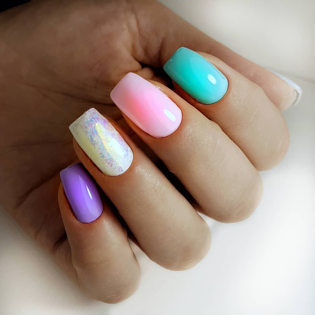 Очень смелый, игривый и незаурядный маникюр получился в стиле разноцветного дизайна «разные ручки». Прокрасьте все пальчики каждый в ином цвете, подобрав, к примеру, приятные пастельные оттенки, что идеально сочетаются друг с другом и подарят вашим ноготочкам небывалое очарование с модным нейл-дизайном «разные ручки».
