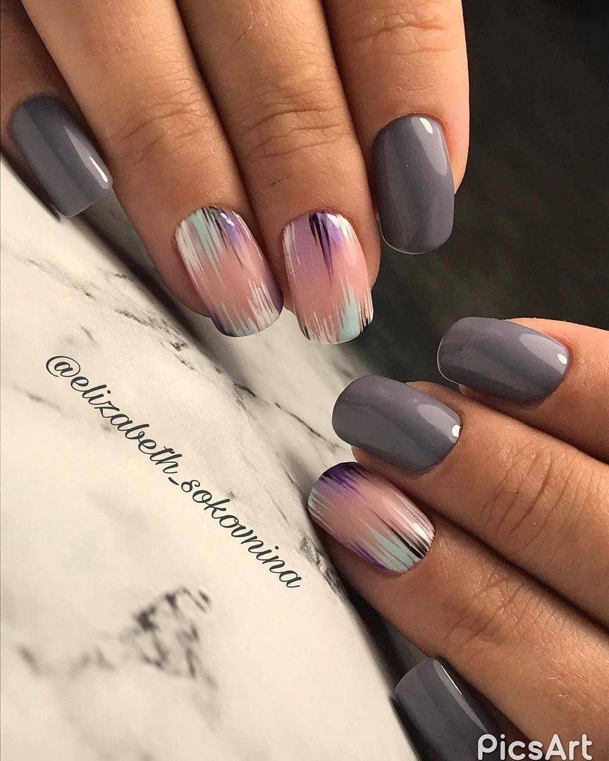 Этот тандем далеко не новинка в нейл-индустрии, но из сезона в сезон он пользуется большой популярностью. А все потому, что маникюр в серо-розовых тонах получается осень спокойным, самодостаточным, нежным и приятным для восприятия, особенно если добавить к нему немного серебристого блеска.
