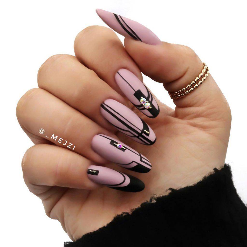 Трендовость «геометрии» на ногтях остается на высоте, будучи предложенной модница в самых неожиданных вариантах маникюра, как это произошло с нашим сегодняшним фаворитом. Модный дизайн ногтей в стиле «разные руки» предлагаем на этот раз выполнить в матовом черно-розовом цвете с акцентом на большом пальчике в виде геометрического принта. В итоге получится стильный и замечательный трендовый маникюр «разные руки» с графическим акцентом.