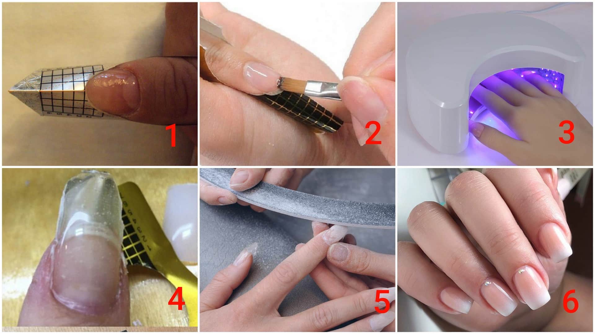 Если вы уже запаслись всеми необходимыми материалами, можно начинать осваивать процедуру поэтапного наращивания ногтей гелем (фото результатов см. в статье). Поможет в этом пошаговая инструкция. По ней легко выполнить наращивание ногтей гелем поэтапно (для начинающих в том числе):