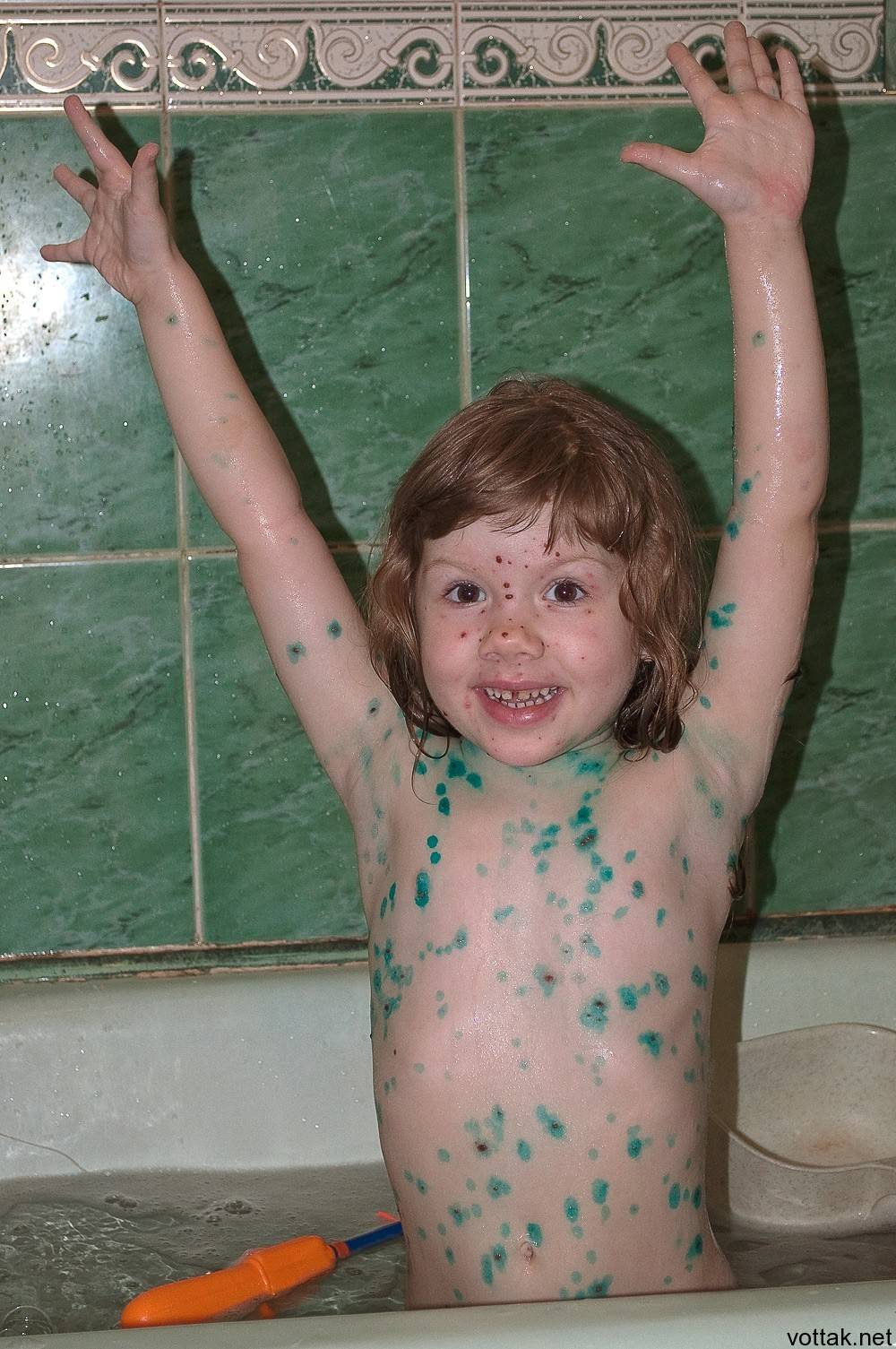 Для малыша будет полезно принять душ или ванну. Дети найдут в ванне избавление от зуда. Не купайтесь в горячей воде, это увеличит зуд и не принимайте ванну слишком долго. Высушите ребенка после душа или купания, не втирая в кожу полотенца, чтобы пузырьки не были повреждены, а корки не отваливались и не оставляли шрамов.