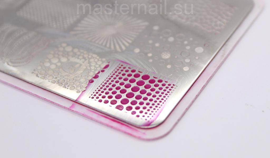 Дело может быть в том, что пластина недостаточно обезжирена и не до конца были удалены остатки краски или лака после предыдущего стемпинг-дизайна. Если ваш клинсер не полностью очищает пластину, то попробуйте специальную жидкость для стемпинга, либо на крайний случай, попробуйте очистить поверхность с помощью жидкости для удаления гель-лака с ногтей.