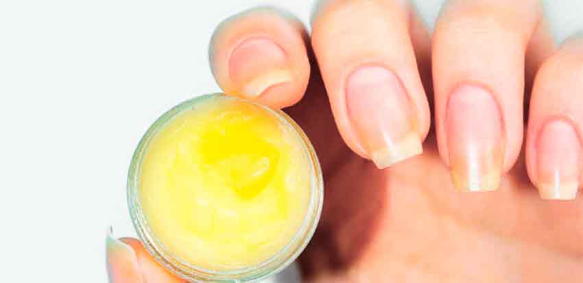 В полученную смесь погрузить пальцы на 20 минут. После этого остатки маски можно удалить руками или салфеткой, но не рекомендуется смывать водой. Повторять 2-3 раза в течение недели.