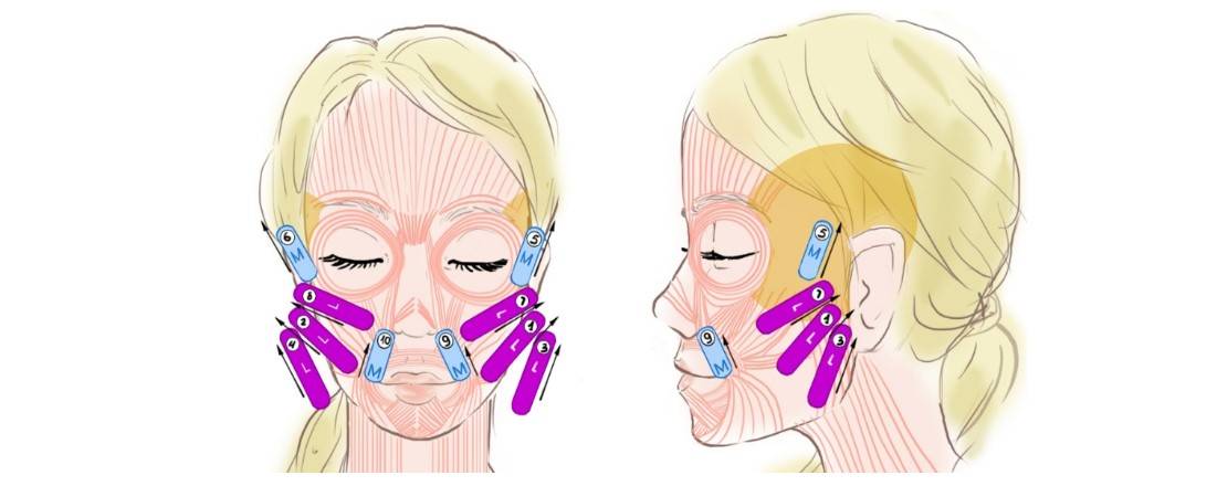 Процедура предполагает наклеивание полосок тейпа разной длины на кожу лица по определенной схеме. Разные методики преследуют разные цели: