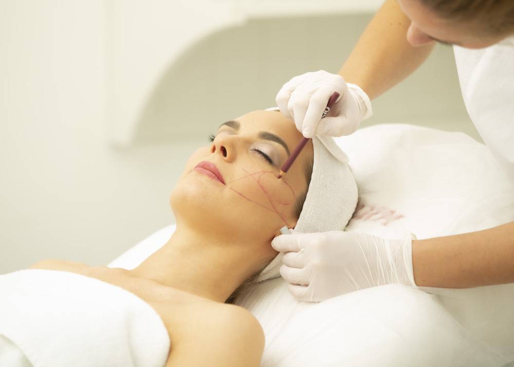 - Врач снимает с лица остатки тонального крема и наносит разметку специальным маркером. При этом области скопления жира доктор обходит.
