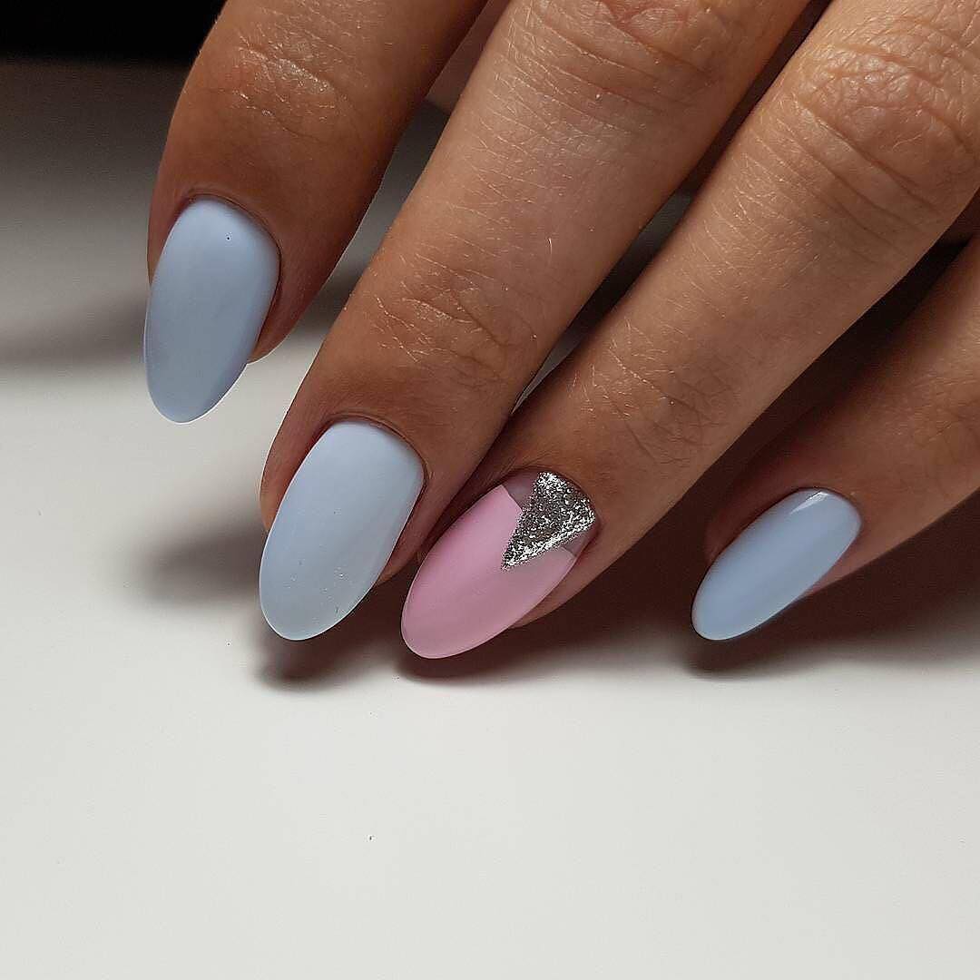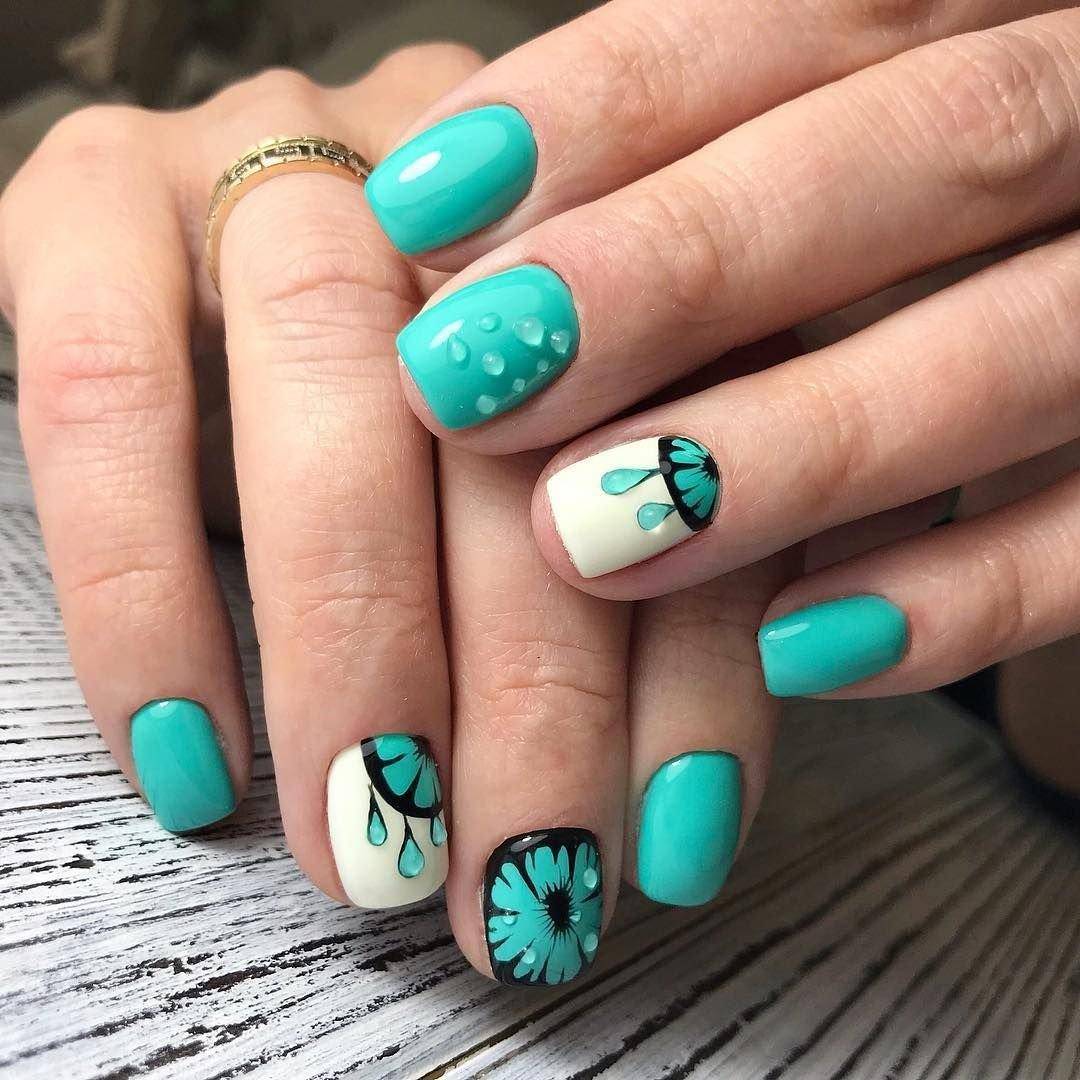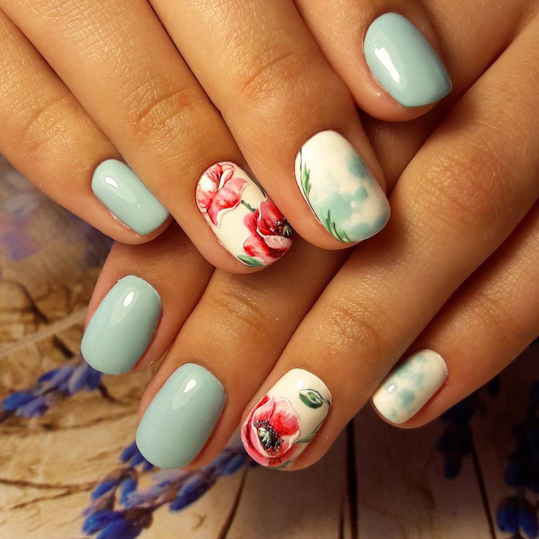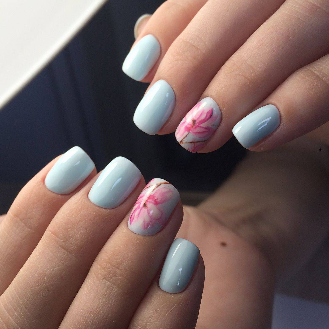 Традиционный весенний цвет маникюра – голубой. Он ассоциируется с чистым весенним небом. На основе голубого гель-лака можно сделать дизайн с цветами, птицами или дождевыми каплями.