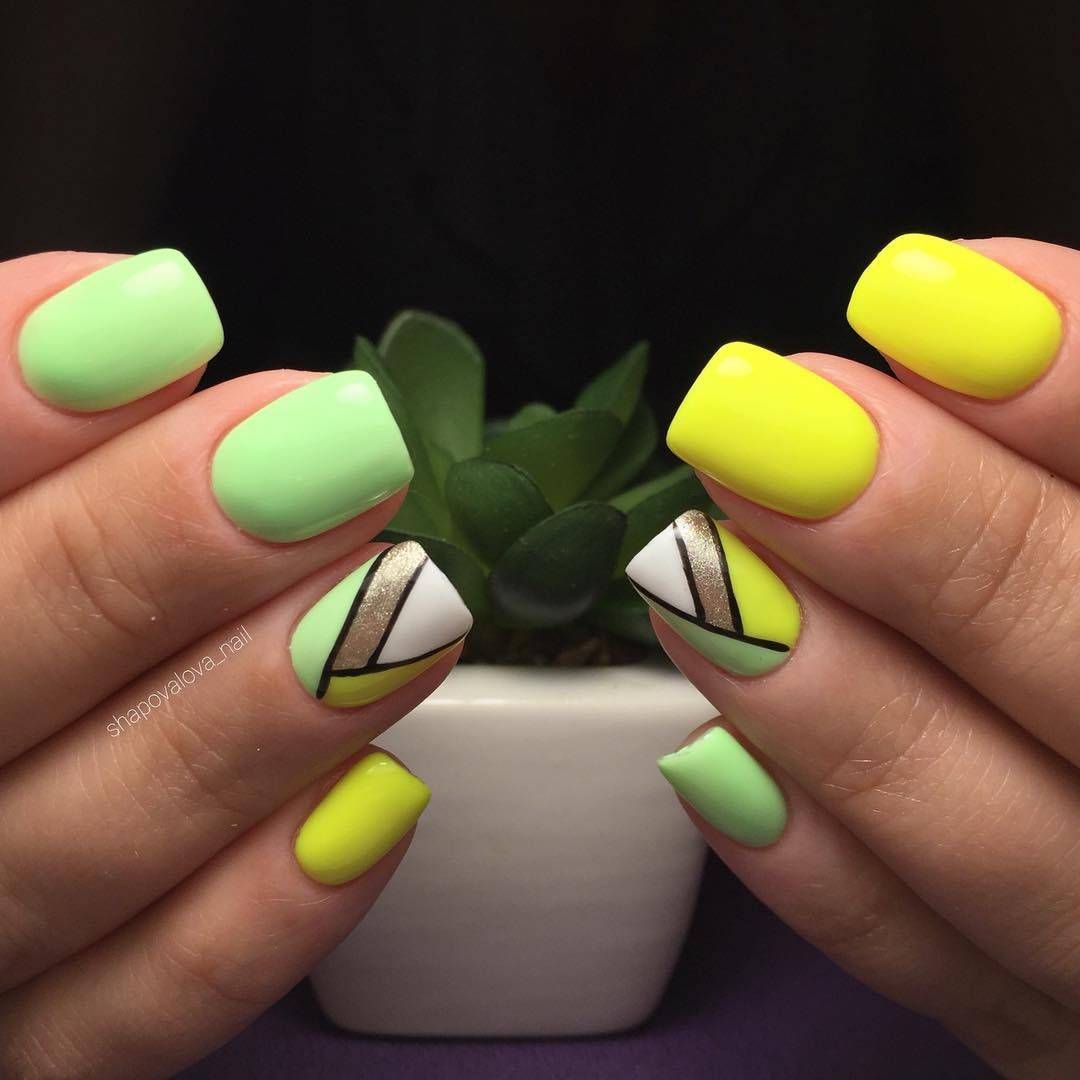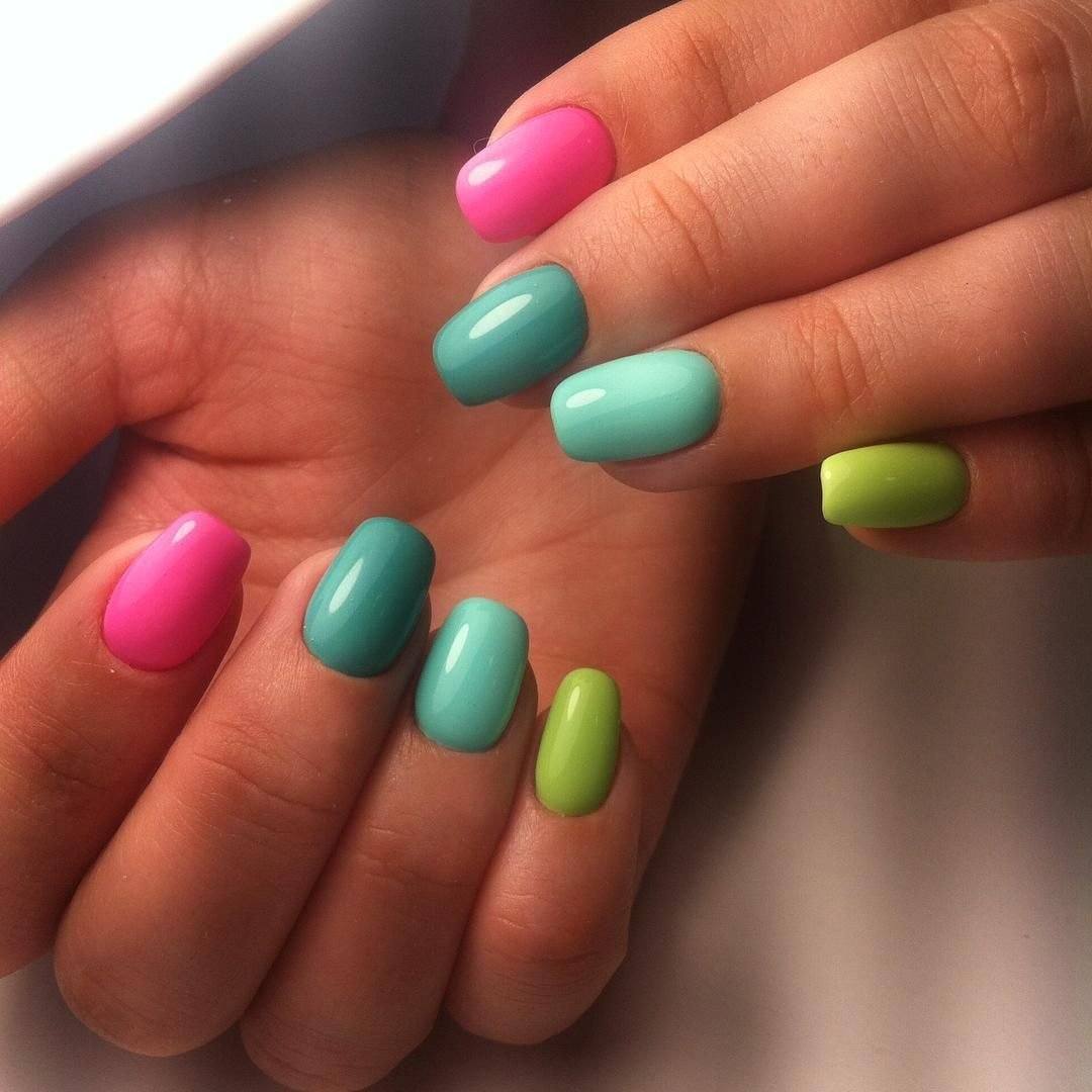 Модный весенний маникюр отлично выполнить в оригинальном дизайне с яркими гель лаками, гармонично сочетая их между собой.