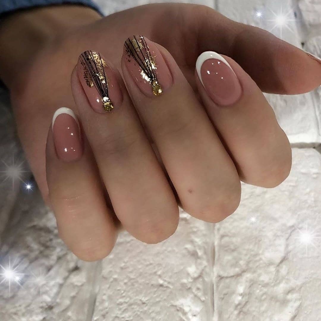 Одним из самых популярных направлений в оформлении коротких ногтей является нанесение лаконичных и стильных рисунков в виде деревьев или веток. Сделать их можно при помощи специальных тонких кистей, а затем дополнить золотистыми или серебристыми ромбами. В результате получится креативный маникюр, подходящий для повседневности.