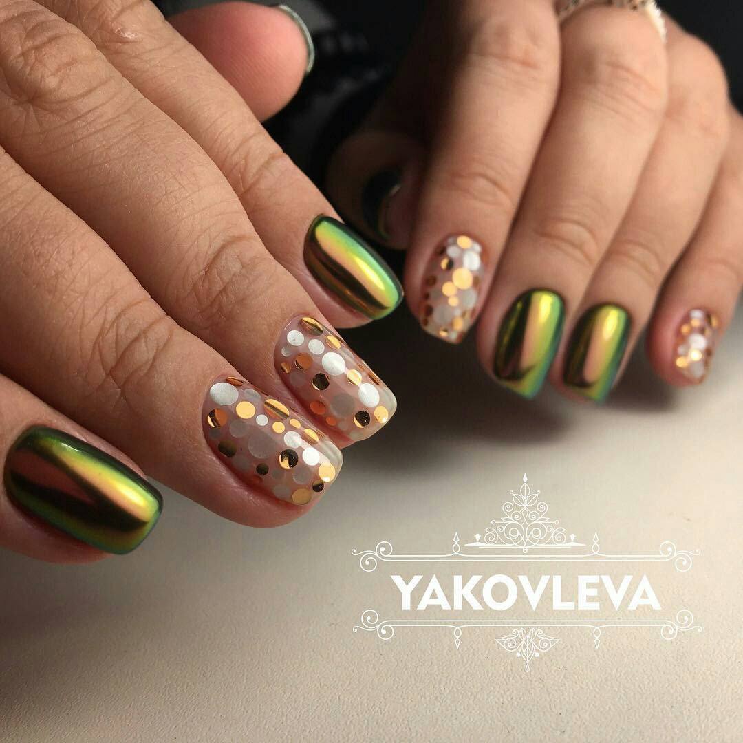Кроме оттенков лака и модных рисунков для дизайнов ногтей, стоит обратить внимание и на популярные в сезоне текстуры. Обычный фон можно кардинально преобразить, посыпав лак акриловой пудрой или бархатным песком, выложив весь ноготь бульонками, или втерев зеркальную втирку
