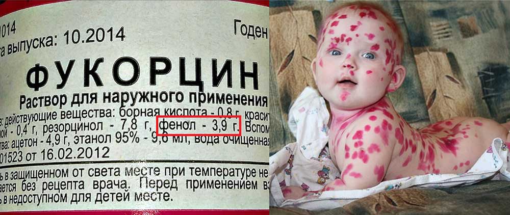 Метиленовый синий. Показан для обеззараживания при воспалительных процессах. Противопоказан детям до года. В 2019 году широко используется родителями.