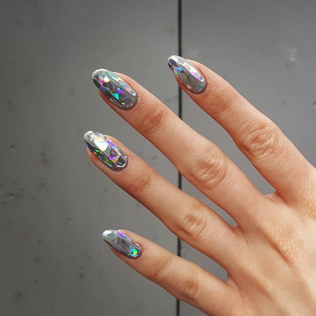 Данная техника витражного маникюра особенно схожа с известным «битым стеклом». Дело в том, что в процессе оформления ногтей используются небольшие кусочки фольги или слюды. Если их выложить равномерно на всей пластине, поверхность визуально очень похожа на витраж. Также при желании можно использовать такой декор, как блестки или стразы.