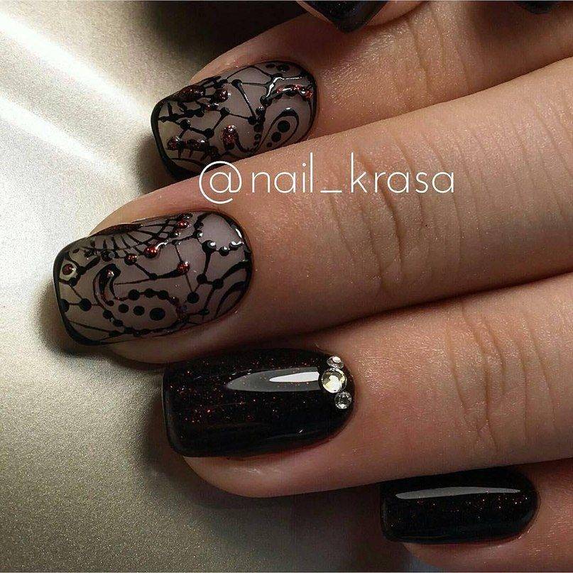 Довольно популярная техника витражного маникюра отличается особой красотой дизайна. В процессе нередко используются глубокие темные оттенки. В данном случае в качестве декора мастера рекомендуют выбирать стразы или блестки. Кстати именно этот вариант часто выбирают для оформления наращенных ногтей. Дело в том, что зачастую они более длинные, что позволяет экспериментировать с дизайном.