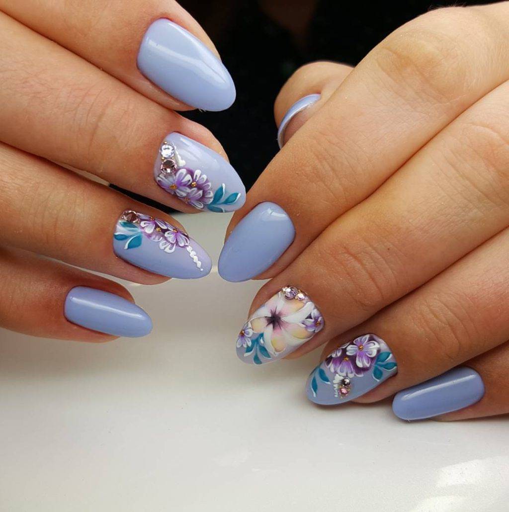- Витражный дизайн ногтей с элементами росписи — вариант для профессионалов. В данном случае акриловой краской на ногтевую пластину наносится узор. Проще всего использовать цветочную тематику или абстракцию.