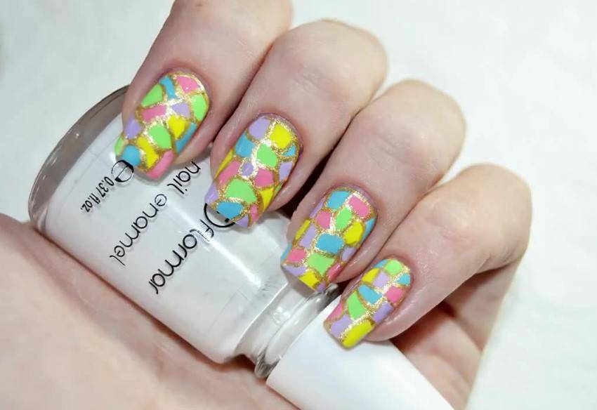 Наносится фон узора. Если рисунок заполнит все пространство, то фон можно не наносить. Нанося элементы декора, необходимо аккуратно и четко прорисовывать линии. Можно использовать гелевую ручку. При контурном и мозаичном дизайне ячейки внутри линий заполняются краской сразу на всех пальцах. Один цвет наносится на нужную ячейку каждого ногтя по очереди. Таким образом, пока будут окрашиваться остальные ногти, пятнышко краски на первой ногтевой пластине уже подсохнет. Цвета не будут перемешиваться между собой, и рисунок будет аккуратным. Некоторые «стеклышки» можно заменить фольгой или слюдой. Черный цвет контура смотрится выигрышней, если другие цвета яркие и сочные. Можно комбинировать яркие, светящиеся в темноте краски с прозрачными ячейками. Такой дизайн обязательно оценят друзья на танцплощадке в ночном клубе. Места соединения «кусочков» подчеркивают черной четкой линией.
