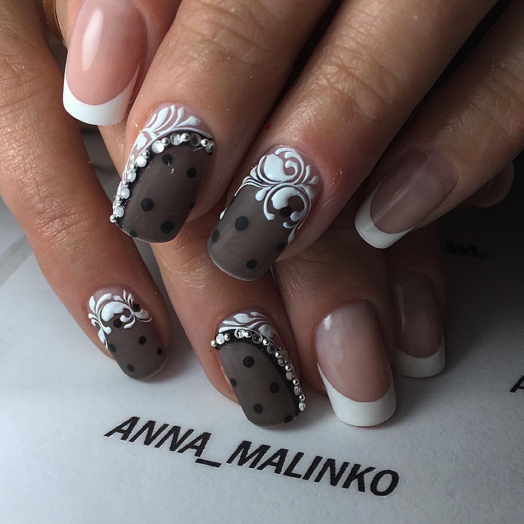 - Комбинированный маникюр может включать элементы всех выше перечисленных разновидностей. Здесь нет предела фантазии, но советуем не слишком увлекаться декором. Не перегружайте ноготки росписью и блестками, это может выглядеть нелепо.